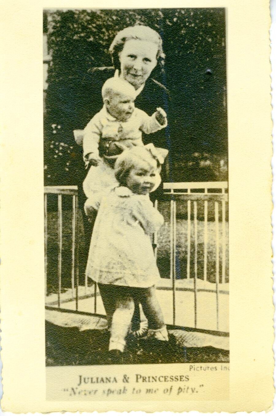 Een zwart-wit foto van prinses Juliana in Canada met de prinsessen Beatrix en Irene. Het onderschrift luidt: "Juliana & Princesses "Never speak to me of pity"." Deze foto's werden door geallieerde vliegtuigen boven Nederland uitgestrooid om de Oranjegezinde bevolking een hart onder de riem te steken. Ze werden dan ook graag verzameld en onderling geruild. De Duitse bezetter probeerde dit tegen te gaan door het bericht te verspreiden dat deze foto's spontaan in brand konden vliegen. Hierdoor kregen ze de naam 'brandplaatjes'.