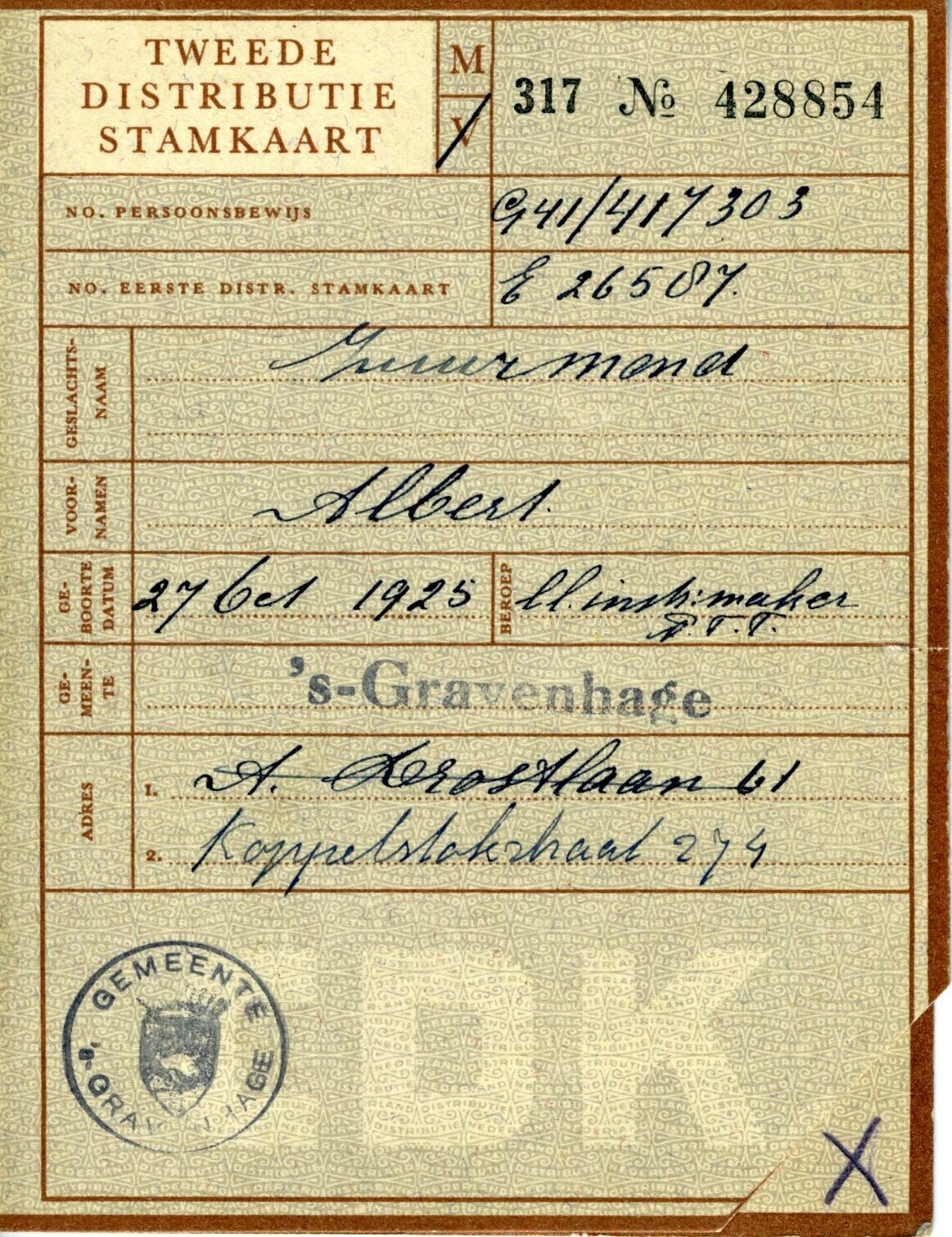 Een "Tweede Distributie Stamkaart" uitgegeven door de gemeente Den Haag op naam van Albert Zuurmond geboren op 27 oktober 1925 en op het moment van uitgave leerling instrumentmaker..