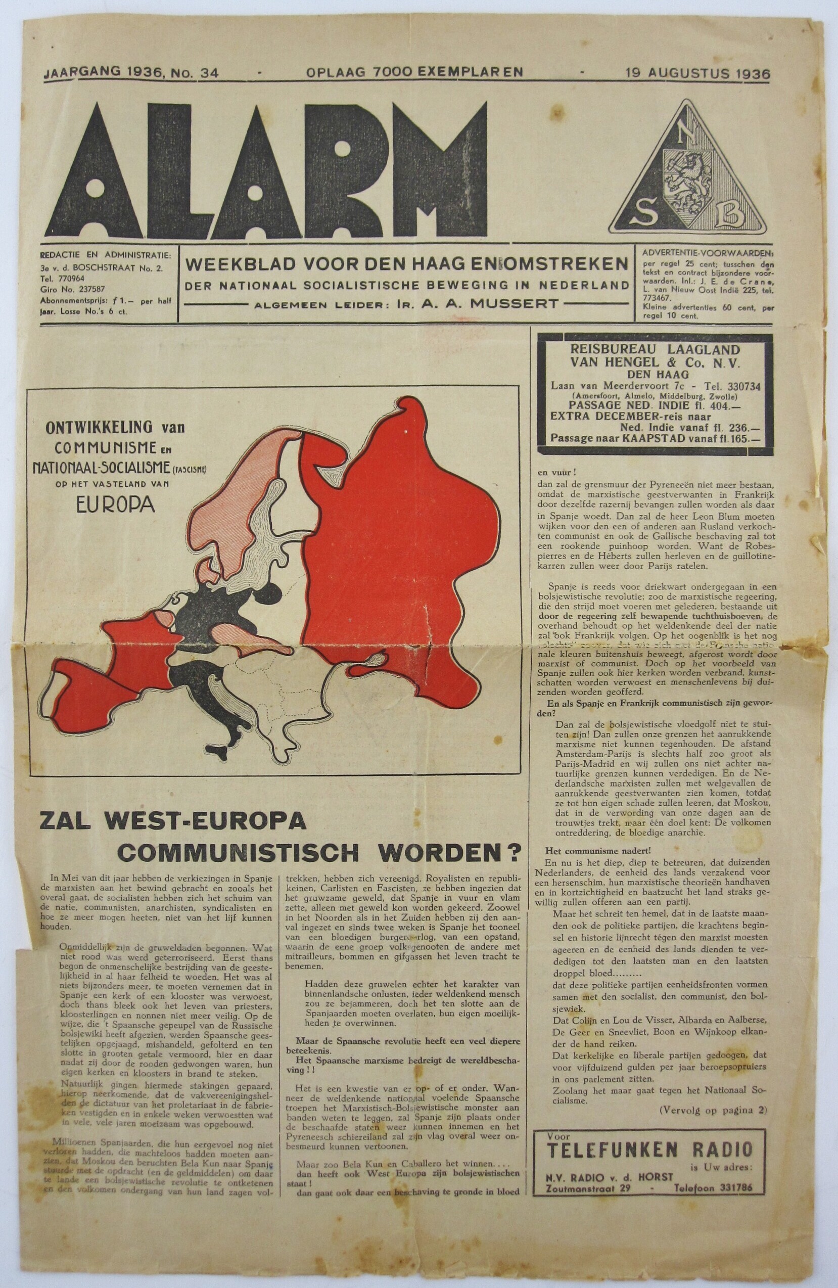 Alarm, weekblad voor Den Haag en omstreken van de N.S.B. Het betreft jaargang 1936, nummer 34 van 19 augustus 1936. Alarm kent een oplage van 7000 exemplaren. Op de voorpagina een kaartje in rood en zwart gedrukt over de ontwikkeling van het communisme.