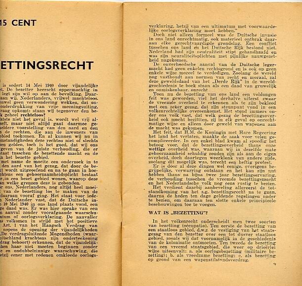 Illegale uitgave van 32 pagina's over de geschiedenis van het bezettingsrecht, het Landoorlogreglement en de houding die de Nederlanders moeten aannemen in verband met de jodenvervolging. Het omslag is blanco.