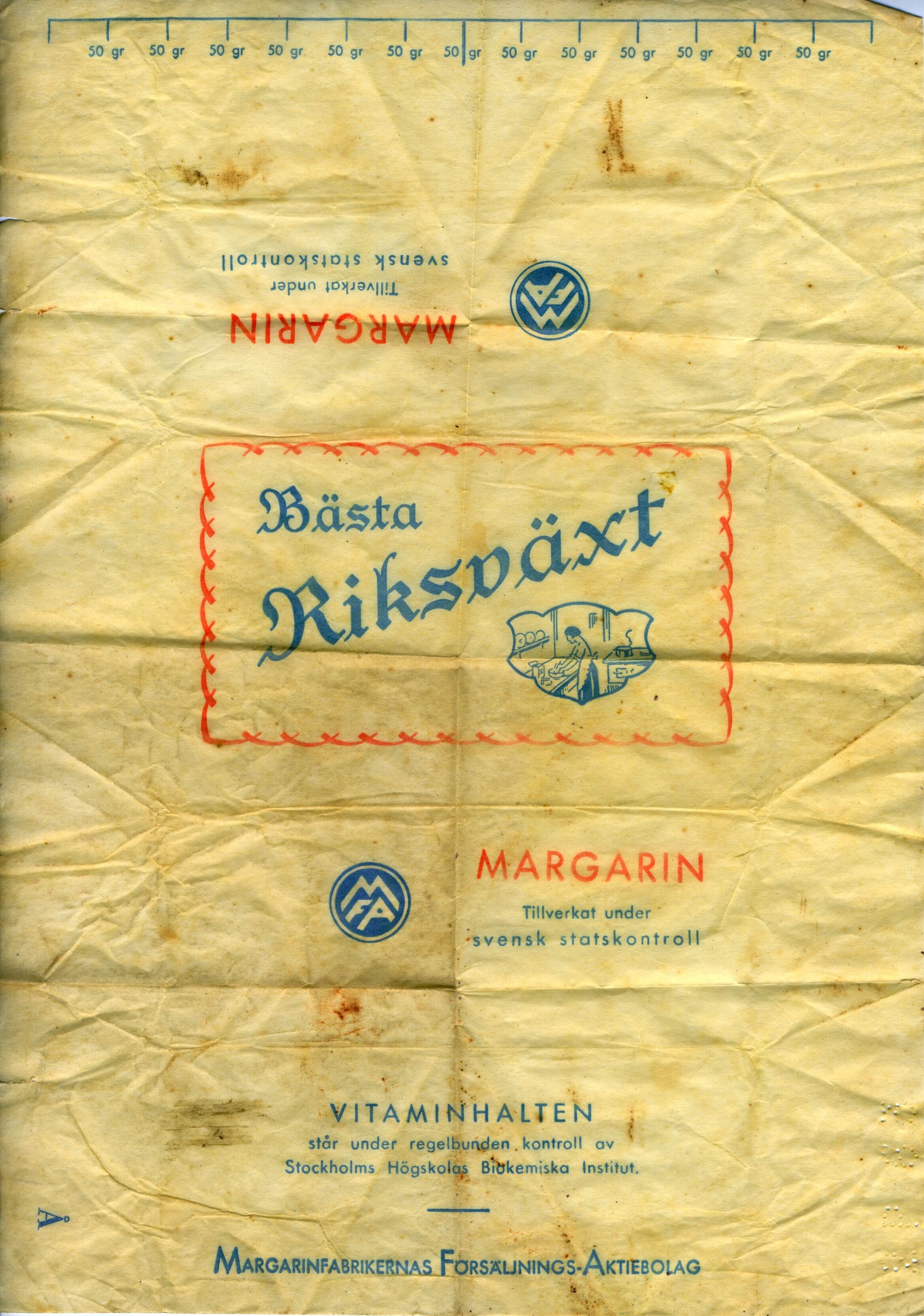 De wikkel van een pakje margarine uit Zweden. Op de wikkel staat o.a.; "Bästa Riksväxt".