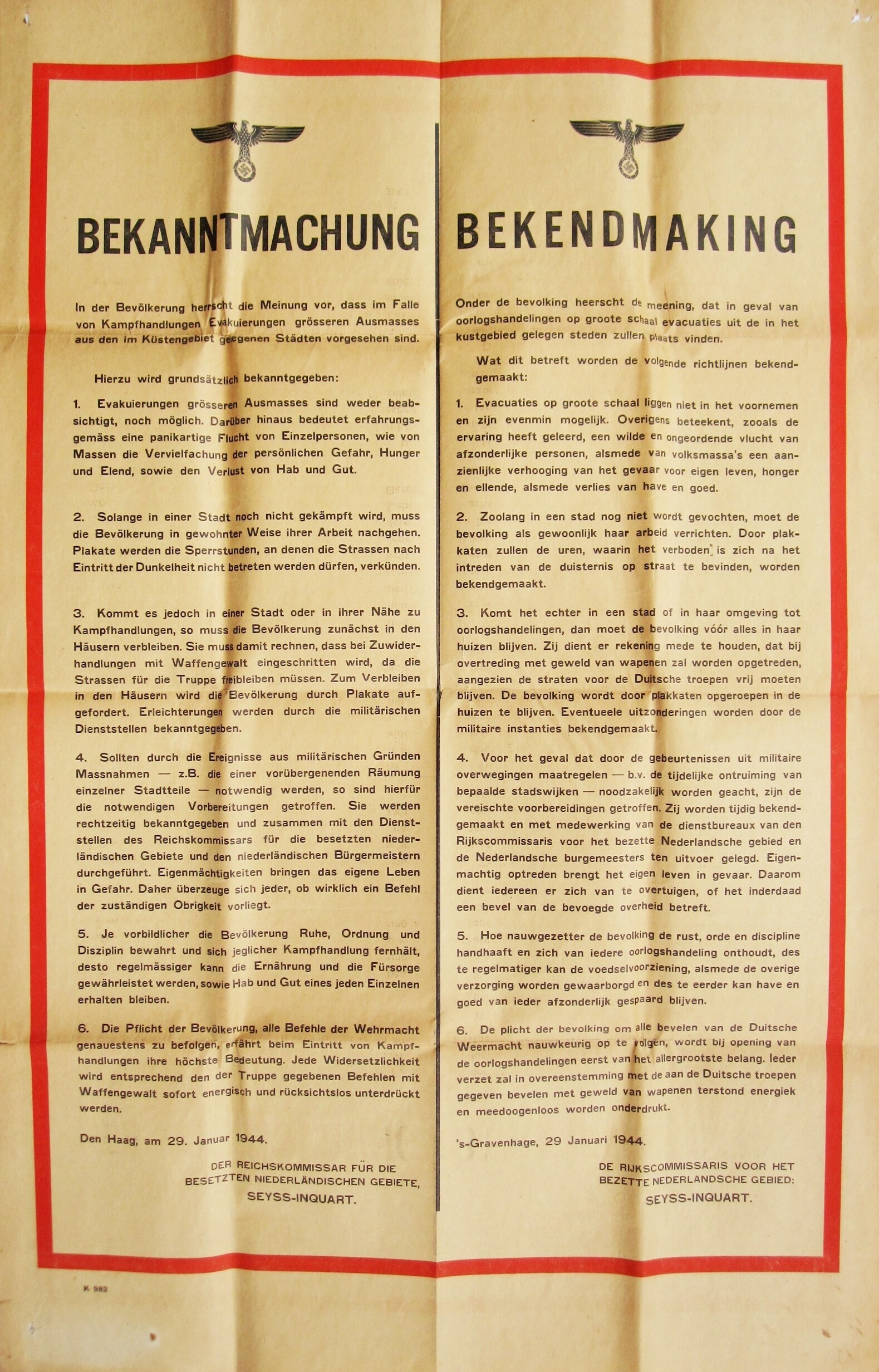 Een gedrukte affiche in het Duits en Nederlands over eventuele evacuaties uit de in het kustgebied liggende steden. Deze 'Bekanntmachung - bekendmaking' is gedateerd: 's- Gravenhage. 29 januari 1944 en ondertekend door "de Rijkscommissaris voor het bezette Nederlandsche gebied: Seyss-Inquart".