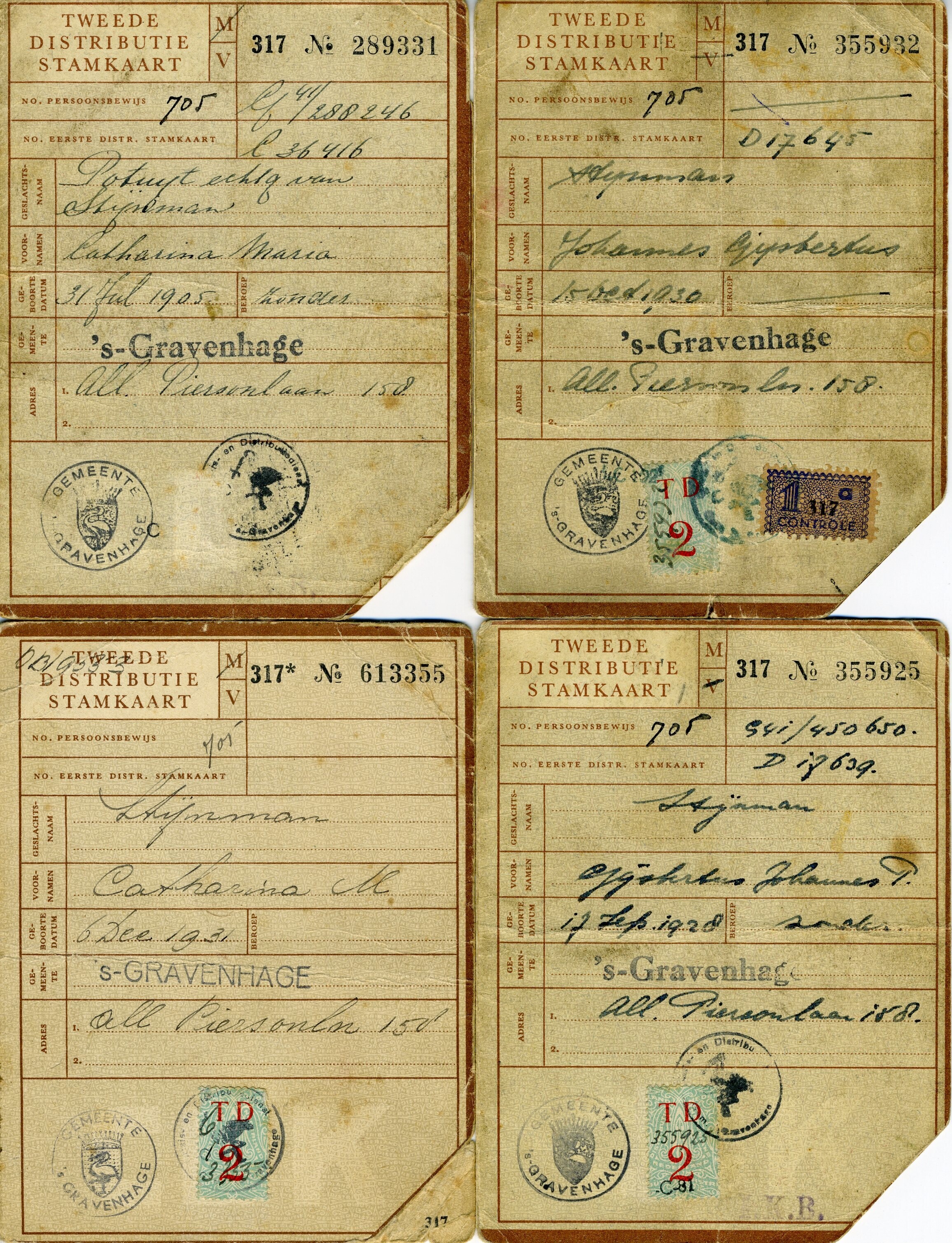 Vier exemplaren van de "Tweede Distributie Stamkaart" uitgegeven te Den Haag op naam van: Catharina M. Stijnman geboren op 6 december 1931; Johannes Gijsbertus Stijnman geboren op 15 oktober 1930; Gijsbertus Johannes P. Stijnman geboren op 17 september 1928 en Catharina Maria Portuyt echtgenote van Stijnman geboren op 31 juli 1905. Toegevoegd is een blad uit een eerder uitgegeven distributie stamkaart, vermoedelijk ook van de familie Stijnman.