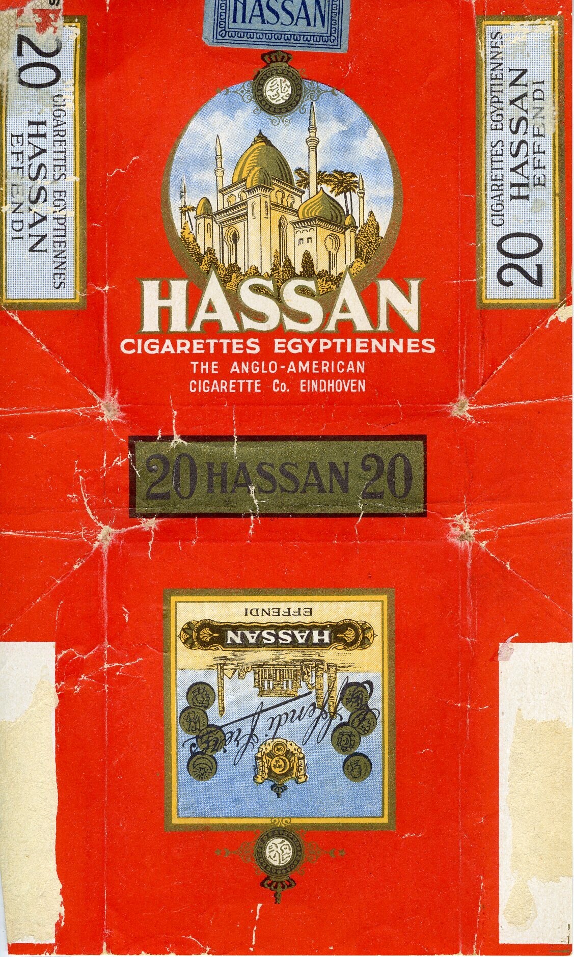 Een verpakking van het sigarettenmerk "Hassan Effendi Cigarettes Egyptiennes. The Anglo-American Cigarette Co. Eindhoven".