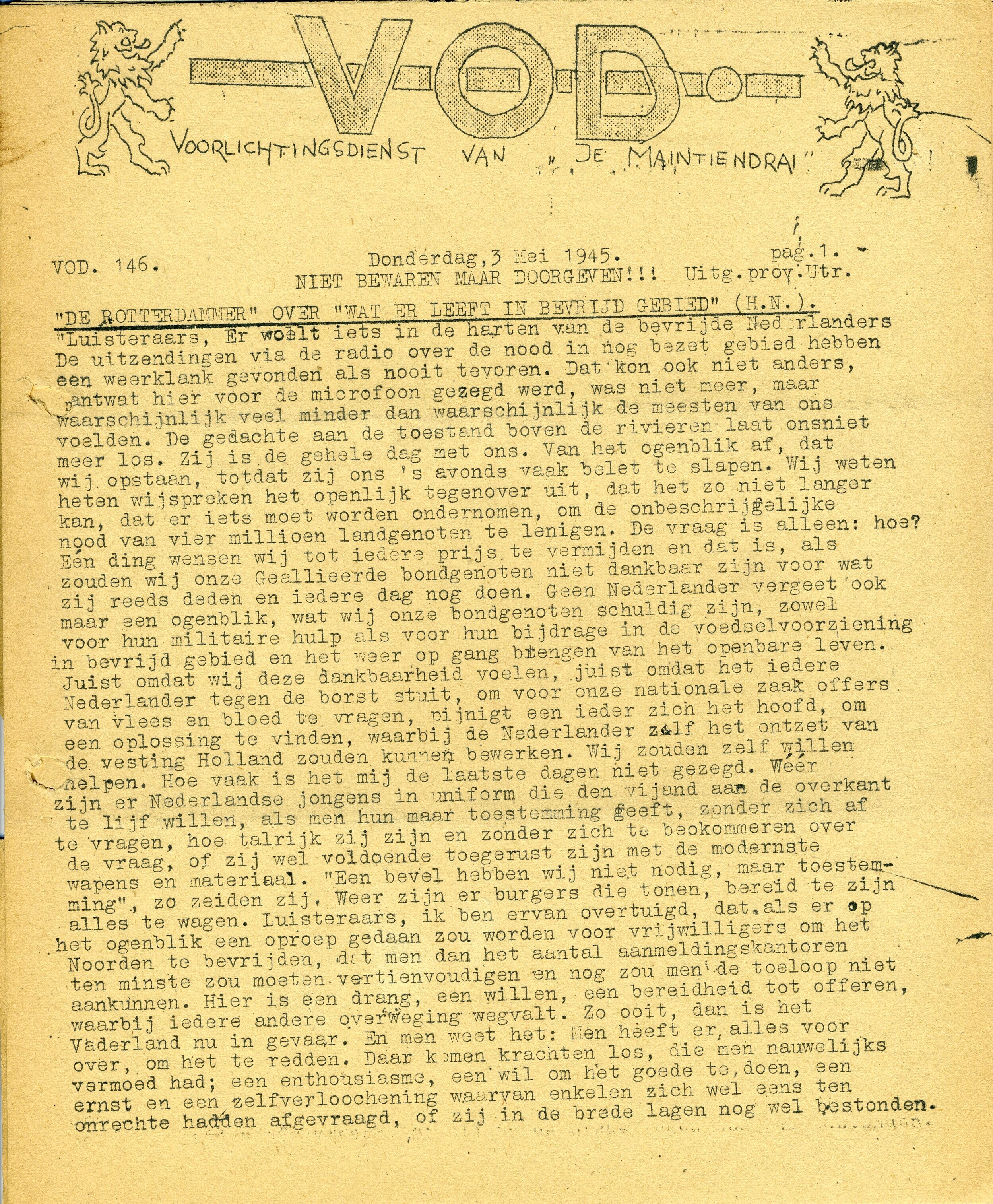 Twee uitgaven van verschillend formaat van het gestencilde verzetskrantje "VOD". het gaat om de uitgaven: VOD. 146 3mei 1945 (5 bladzijden); Bevrijdingsnummer VOD 10 mei 1945 (2 bladzijden).