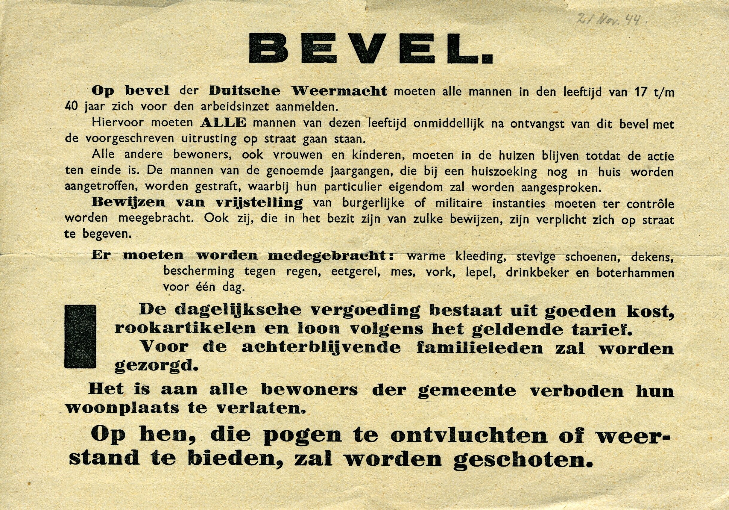 Een pamflet met de kop "Bevel". Hierin wordt bevolen dat op last van de "Duitsche Weermacht" alle mannen in de leeftijd van 17 t/m 40 jaar zich moeten aanmelden voor de arbeidsinzet met instructies en dreigementen.