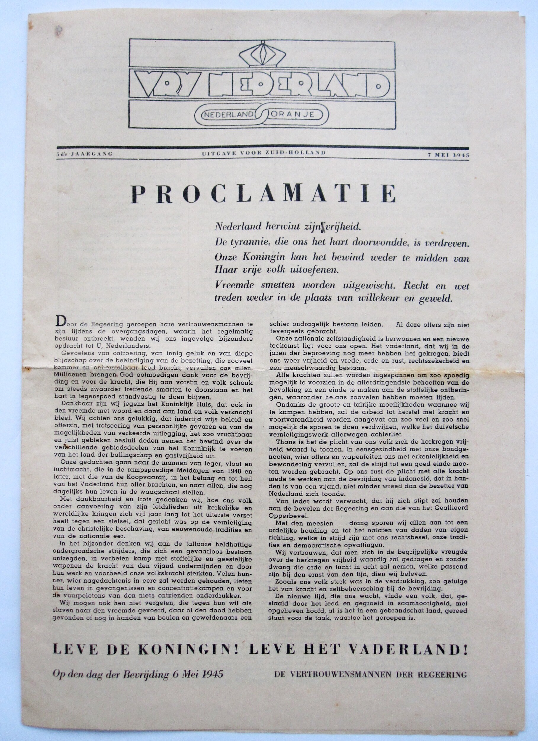 Een uitgave van het blad: "Vrij Nederland. 5de Jaargang Uitgave voor Zuid-Holland 7 mei 1945" met als hoofdartikel: "Proclamatie", afsluitend met "Leve de Koningin! Leve het Vaderland! Op den dag der Bevrijding 6 mei 1945 De vertrouwensmannen der Regeering".