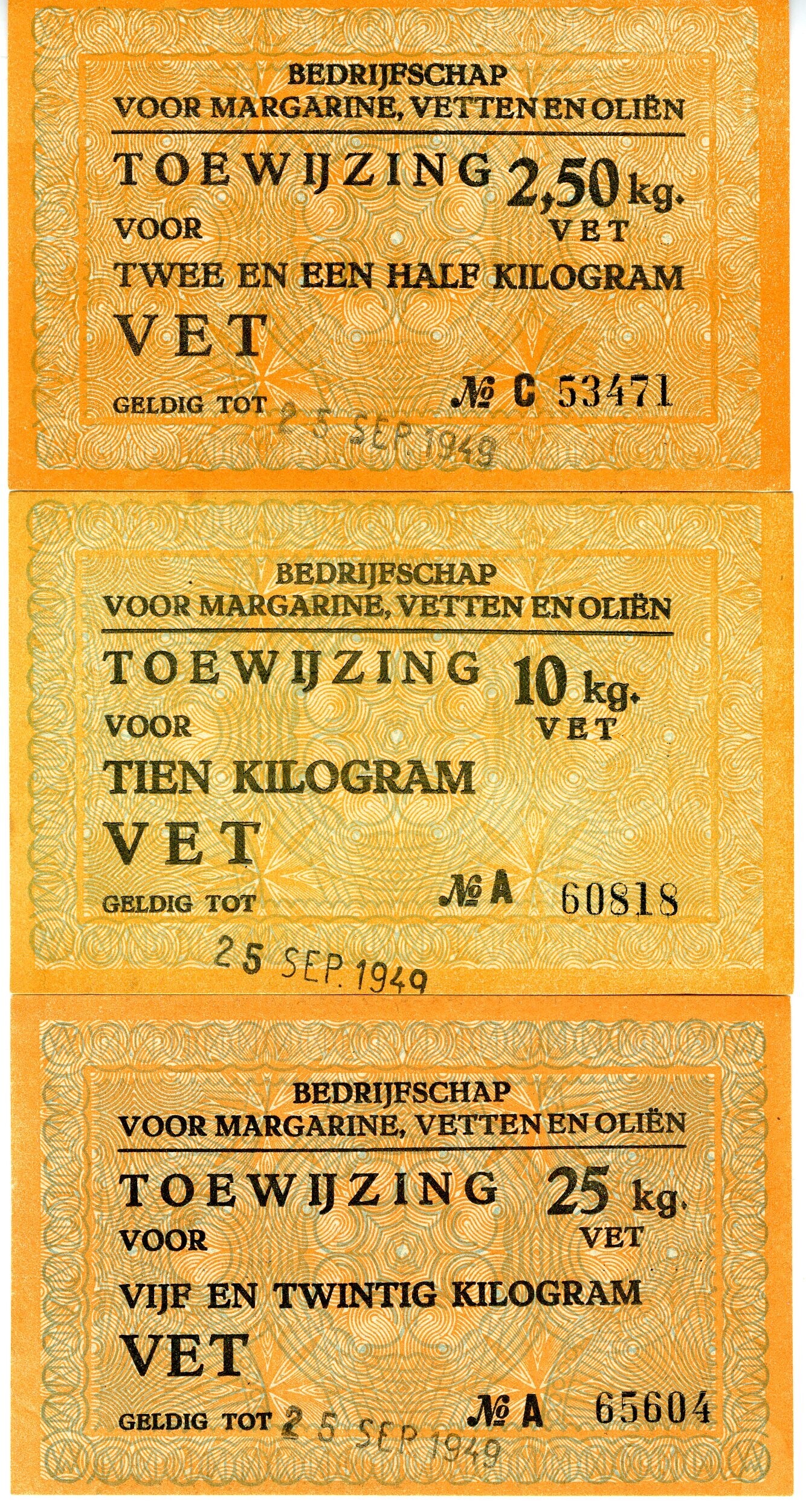 Vijf bonnen voor het verkrijgen van vet. Op de voorkant van de bonnen staat: a. "Bedrijfschap voor margarine, vetten en oliën. Toewijzing voor twee en een half kilogram vet geldig tot 25 sep. 1949 No. C 53471"; b. "Bedrijfschap voor margarine, vetten en oliën. Toewijzing voor tien kilogram vet geldig tot 25 sep. 1949 No. A 60818"; c. "Bedrijfschap voor margarine, vetten en oliën. Toewijzing voor vijf en twintig kilogram vet geldig tot 25 sep. 1949 No. A 65604"; d. "Nederlandsche Zuivelcentrale (M.V.O.) Toewijzing voor het koopen van honderd kilogram vet geldig tot 25 sep. 1949 No. 047703"; e. "Nederlandsche Zuivelcentrale (M.V.O.) Toewijzing voor het koopen van honderd kilogram vet geldig tot 25 sep. 1949 No. 047704". Op de achterkant van de eerste drie overwegend oranje bonnen kan het "Nummer hoofdbedrijfschap voor akkerbouwproducten" en de adressering worden ingevuld. Op de achterkant van de laatste twee overwegend grijze bonnen kan het "Nummer meelcentrale" en de adressering worden ingevuld.