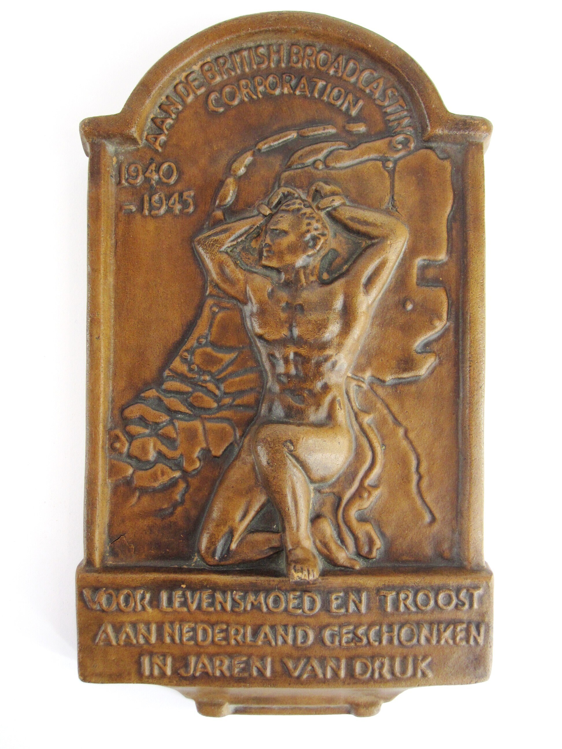 Een bruin geglazuurde rood aardewerken herdenkingsplaquette met in hoog reliëf meegegoten getoogde lijst. Hierbinnen eveneens in hoog reliëf de afbeelding van een geknielde naakte man met de geboeide polsen boven het hoofd geheven tegen de achtergrond van de kaart van Nederland, waarop de loop van de rivieren staat aangegeven. Bovenaan deze afbeelding staat: "Aan de British Broadcasting Corporation 1940-1945". Onderaan op de lijst staat: "Voor levensmoed en troost aan Nederland geschonken in jaren van druk". In de achterkant is een horizontaal ophangoog aangebracht.