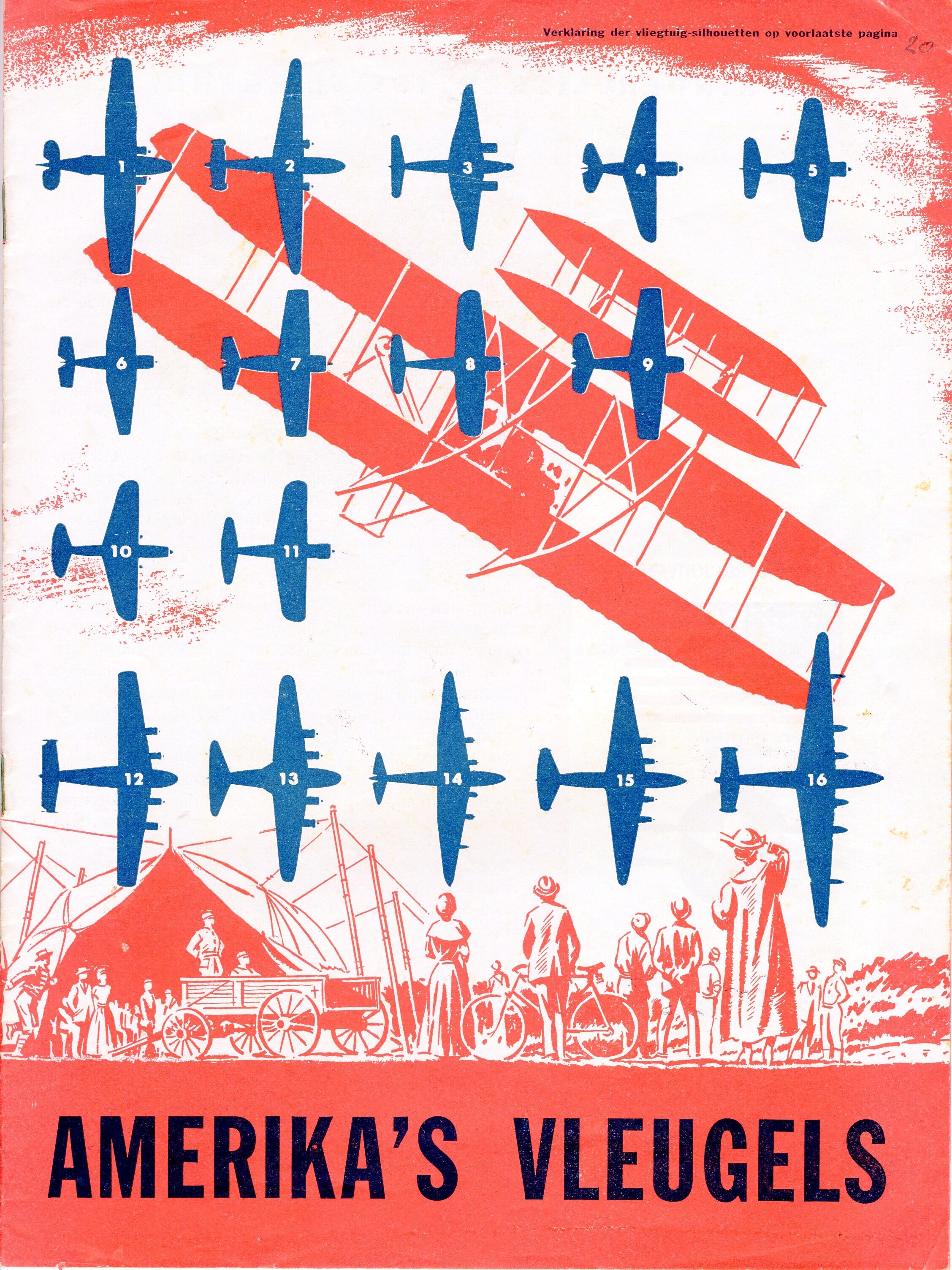 Een gedrukt stripboek in de kleuren rood, wit en blauw met op de kaft: "Amerika's vleugels. Verklaring der vliegtuigen op voorlaatste pagina" en een afbeelding van een laag over een groep toeschouwers vliegende historische dubbeldekker met over deze afbeelding heen de genummerde silhouetten van modernere vliegtuigen. Op de achterkant van de kaft staat: "Uitgegeven door den informatiedienst der Vereenigde Staten US 936 DU". In het stripboek wordt de geschiedenis van de Amerikaanse luchtvaart tot en met 1944 in beeld gebracht.
