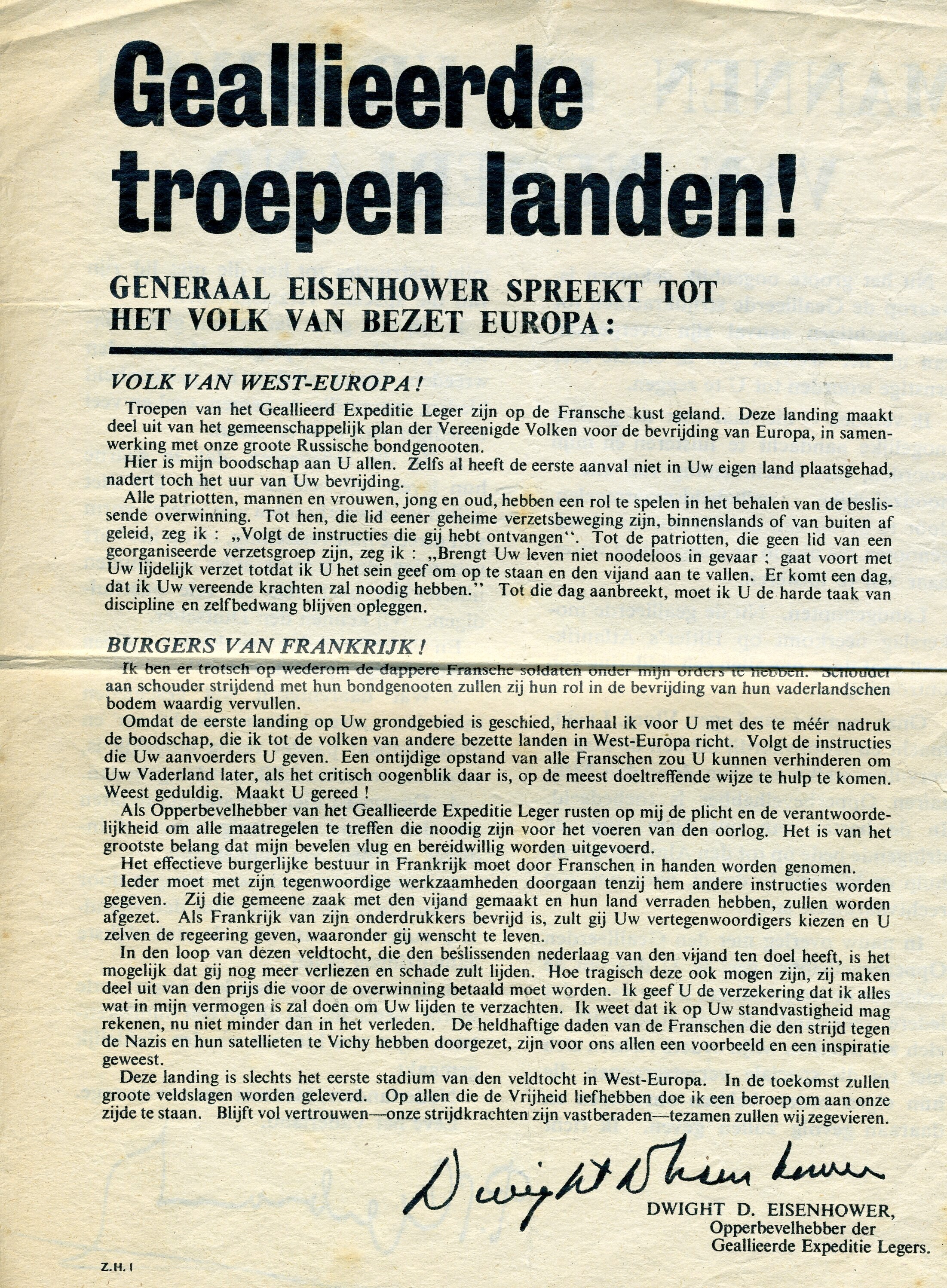 Een aan twee kanten bedrukt pamflet. Op één kant de kop: "Geallieerde troepen landen! Generaal Eisenhouwen spreekt tot het volk van bezet Europa" en ondertekend door "Dwight D. Eisenhower, Opperbevelhebber der Geallieerde Expeditie Legers." Op de andere kant de kop: "Mannen en vrouwen van Nederland" en ondertekend door P.S. Gerbrandy.