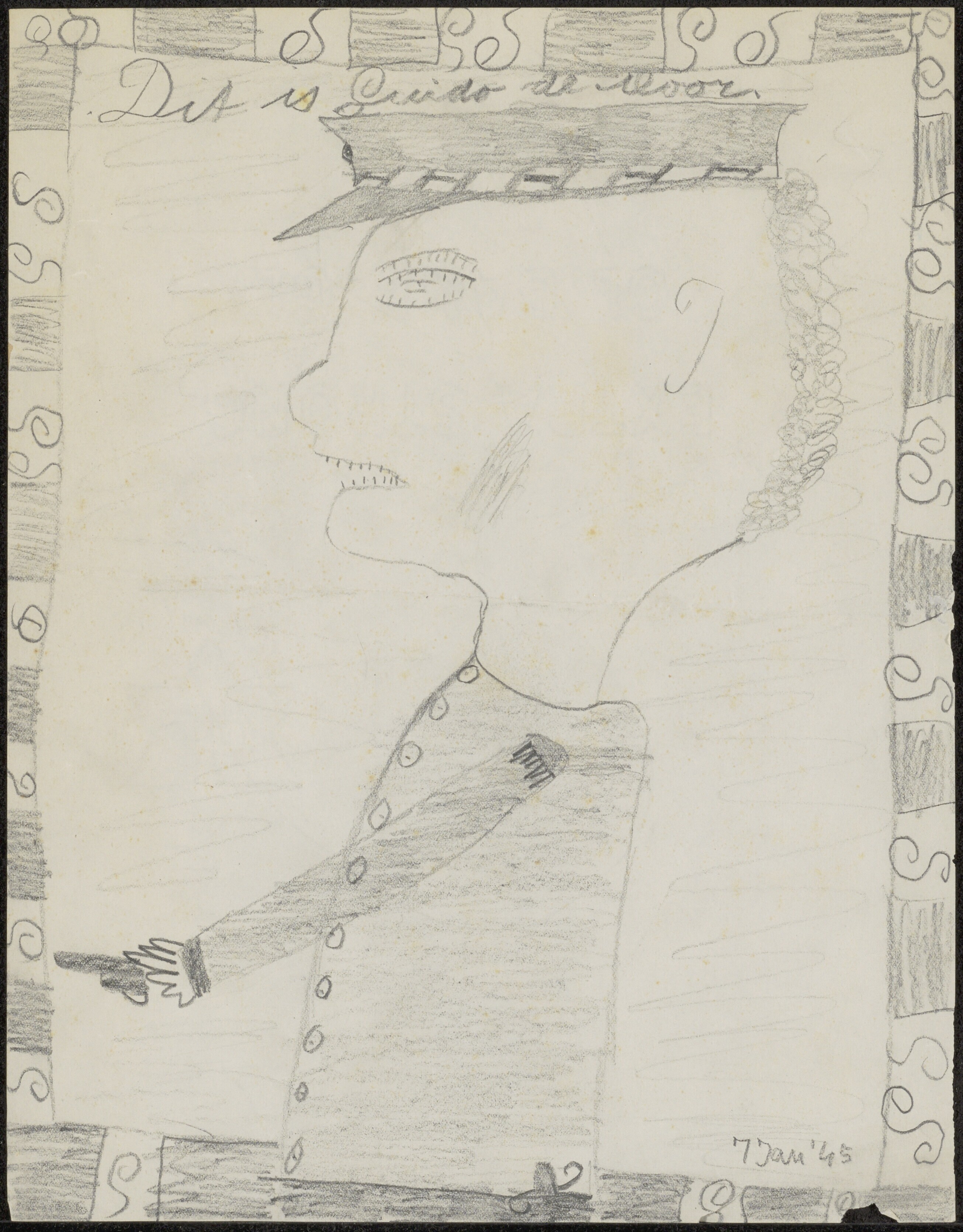 Twee vrijwel identieke potloodtekeningen: een zelfportret "Dit is Guido de Moor, 7 jan. '45" en een portret van een militair "Van Guido de Moor voor mamma de Moor 14 febr. '45".