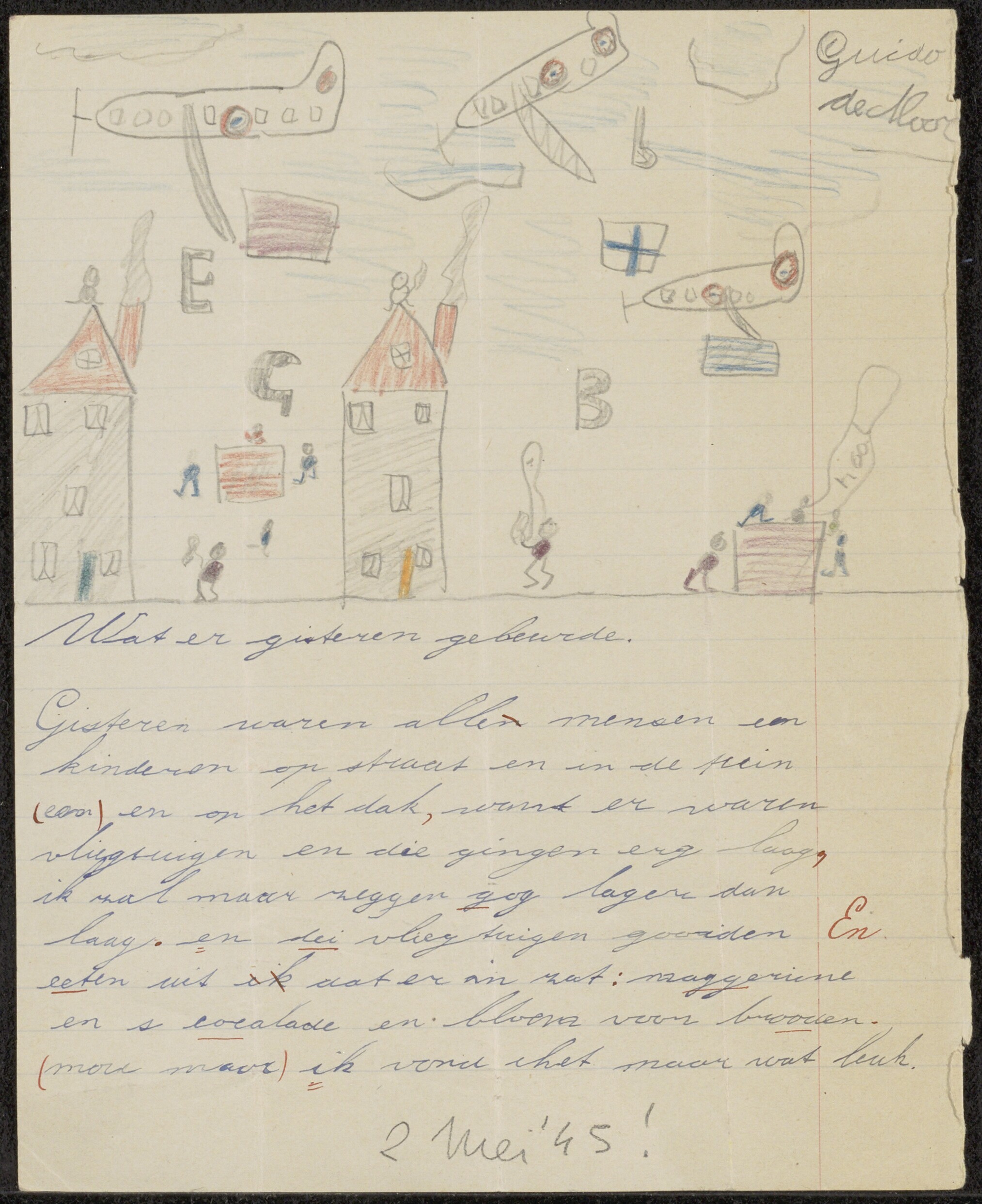 Drie potloodtekeningen met de afbeelding van voedseldroppingen. Eén ingekleurde tekening met daaronder en volgend op de achterkant een met blauwe pen geschreven en met rode pen gecorrigeerd opstel over een voedseldropping onder de titel: "Wat er gisteren gebeurde." Eén met op de voor en achterkant tekeningen van de voedseldropping en een met potlood geschreven tekst over een voedseldropping onder dezelfde titel als het voorgaande blad. Een tekening met de voorstelling van een voedseldropping zonder tekst.