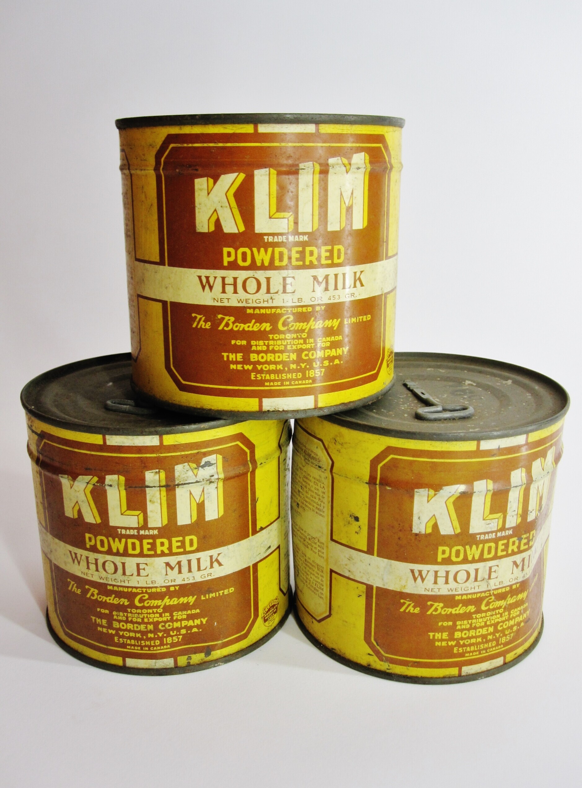 Drie conserven blikken "Klim powdered whole milk". Op de bovenkant van elk blik is een sleuteltje vastgezet waarmee het blik is te openen. De blikken maakten deel uit van de voedselpakketten uit voedseldroppings boven Den Haag.