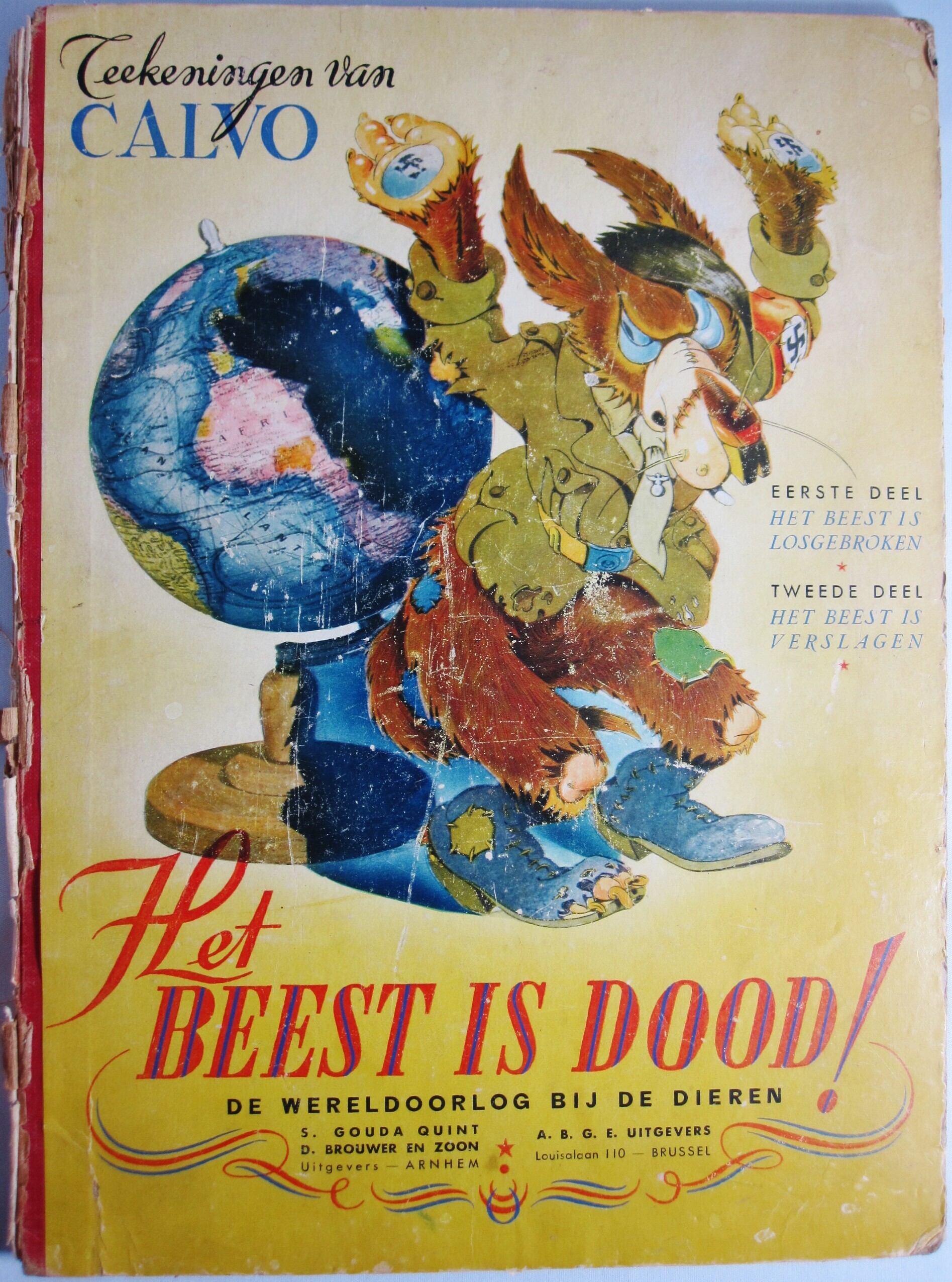 Een stripboek uitgegeven in kleurendruk met een kartonnen kaft. Op de voorkant van de kaft is de afbeelding gedrukt van een gehavende wolf, waarin Adolf Hitler is te herkennen. Hij staat met de poten omhoog voor een wereldbol waar zijn schaduw gedeeltelijk over valt. Tekst op de kaft: "Teekeningen van Calvo. Eerste deel: Het beest is losgebroken. Tweede deel: Het beest is verslagen. Het beest is dood! de wereldoorlog bij de dieren. S. Gouda Quint, D. Brouwer en zoon Uitgevers - Arnhem. A.B.G.E. Uitgevers Louisalaan 110 - Brussel". Op de laatste pagina staat: "Gedurende de bezetting ontworpen en in vrijheid uitgevoerd door Victor Dancette in de lommerrijke dreven van de Vésinet. Met illustraties van Calvo. Het is gegraveerd en gedrukt onder leiding van William Péra. Afgedrukt in Juni 1946 in het vertrouwen, dat het Beest nu morsdood is. Tekst van Mien van Mulders-Chrispeels". Oorspronkelijk uitgegeven in Frankrijk in 1944 onder de titel: La bête est morte !
