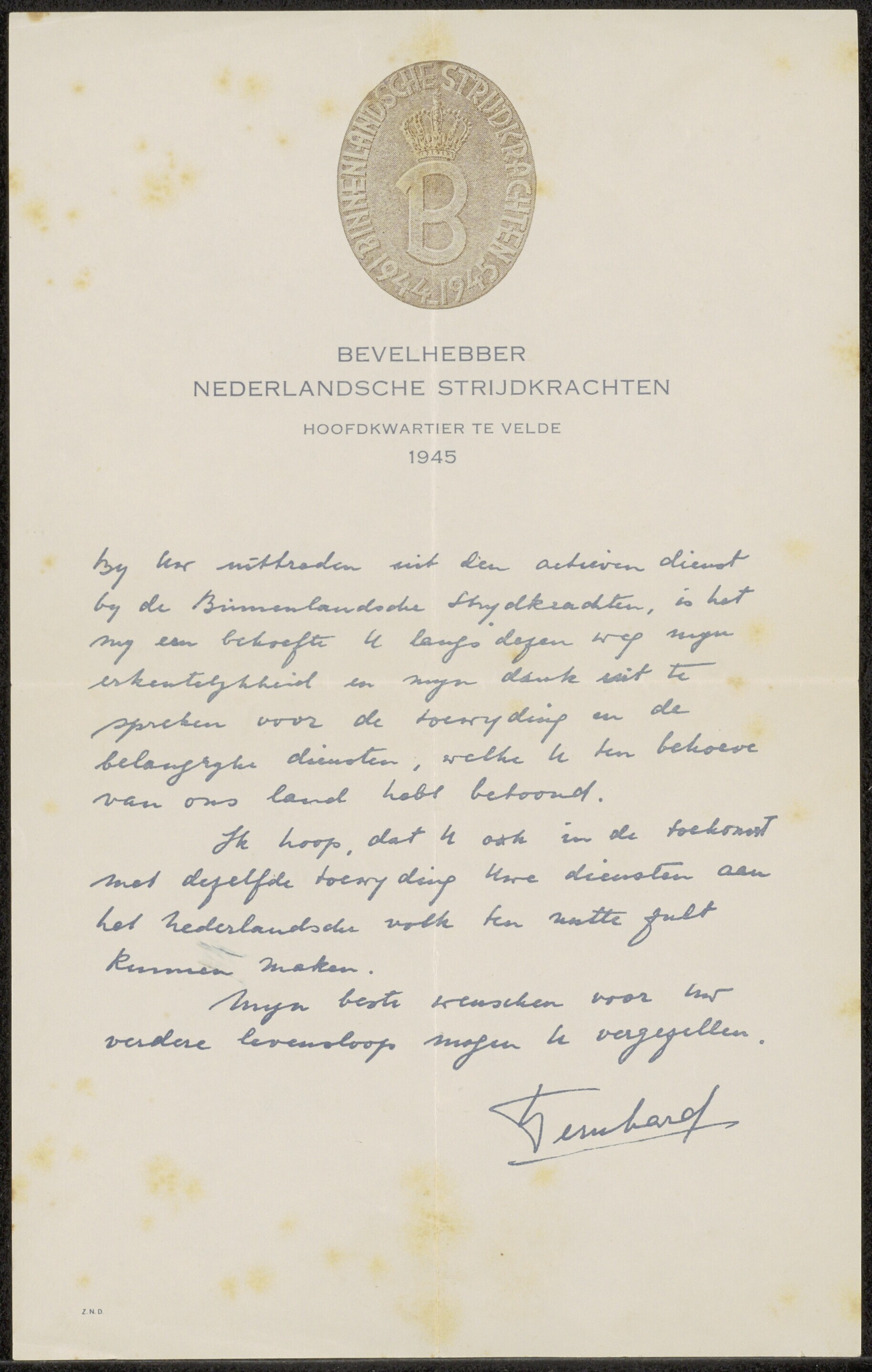 Een bedankbrief van prins Bernhard de "Bevelhebber Nederlandsche Strijdkrachten" ter gelegenheid van "het uittreden uit den actieven dienst bij de Binnenlandsche Strijdkrachten".