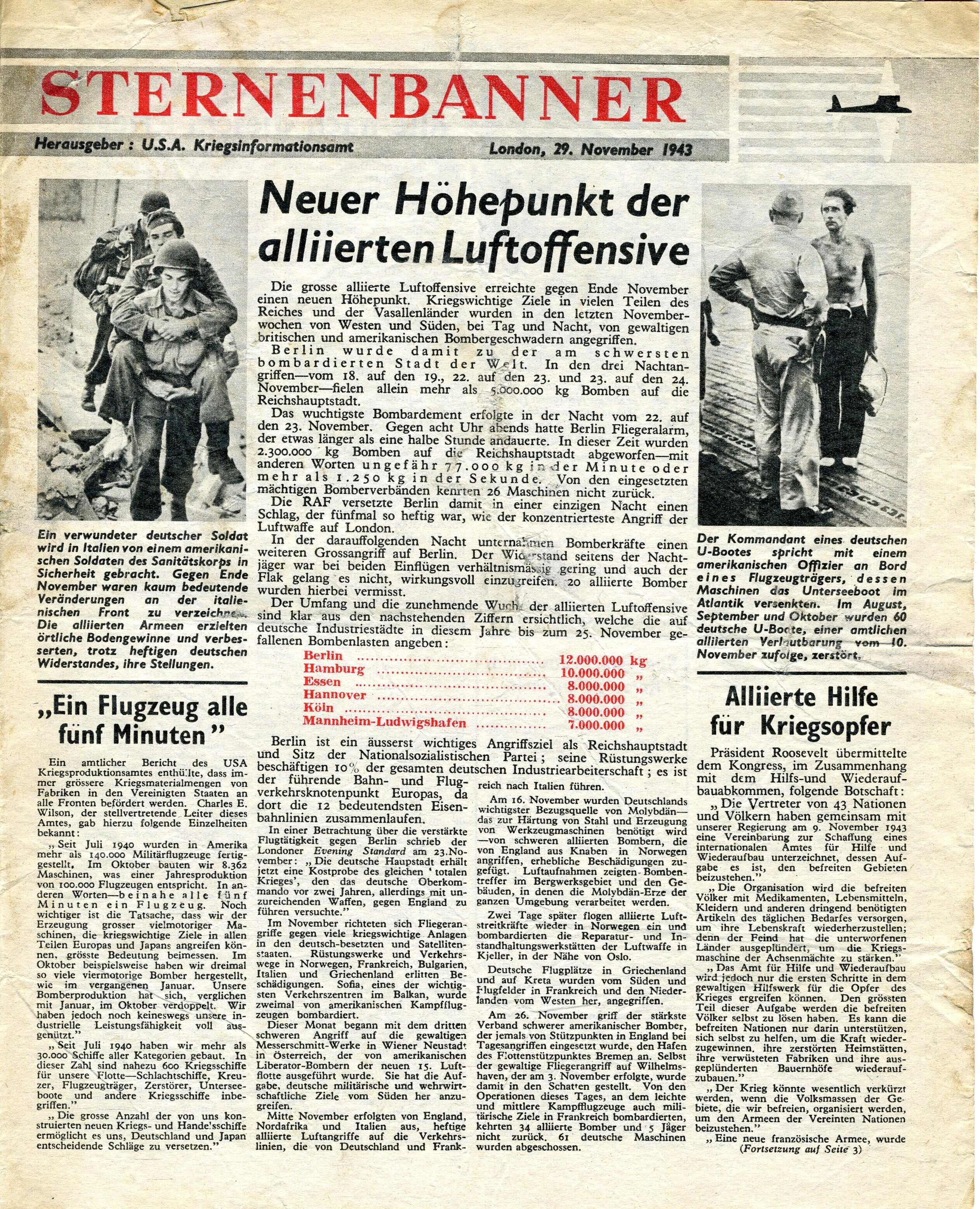 Duitstalige krant die door het Amerikaanse leger werd verspreid onder de Duitse troepen. De titel "Sternenbanner" verwijst naar de Amerikaanse vlag. De krant omvat vier geïllustreerde pagina's met oorlogsberichten.