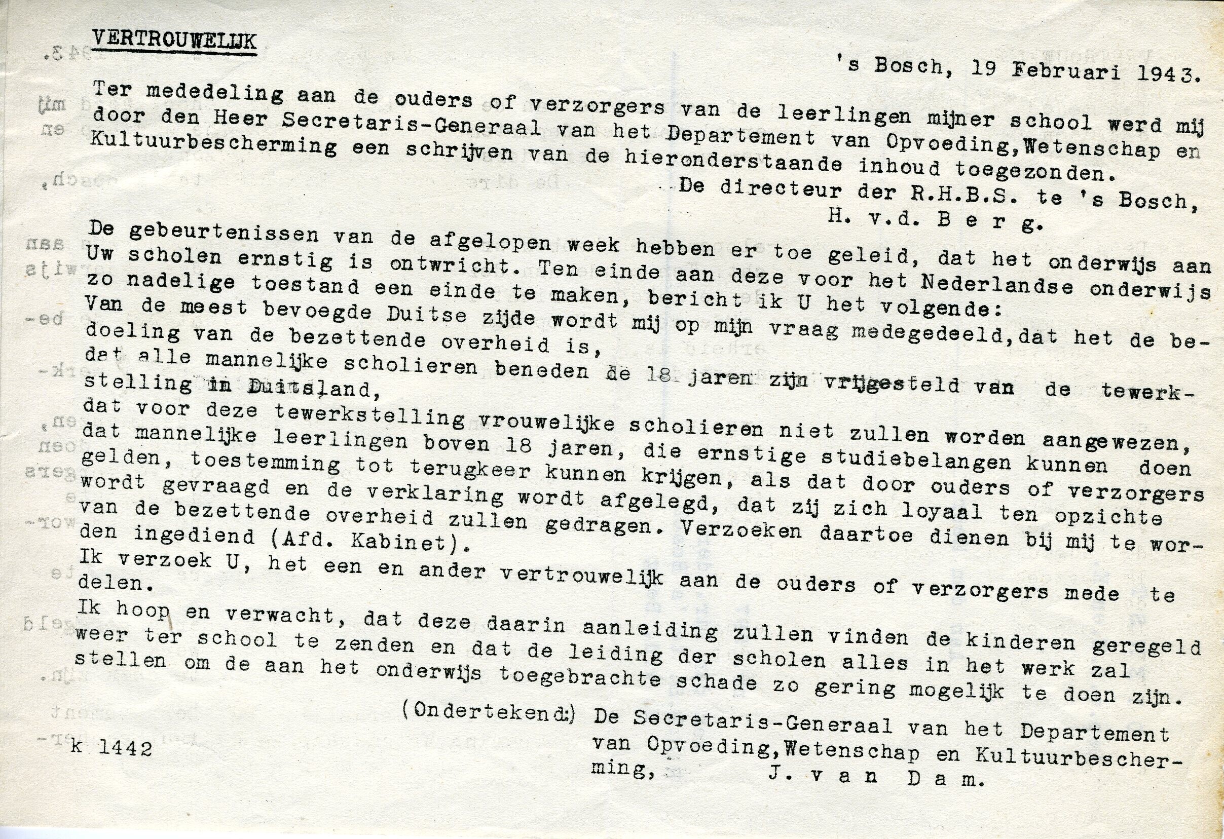 Mededeling van directeur H. v.d. Berg van de R.H.B.S in Den Bosch aan het Departement van Opvoeding, Wetenschap en Cultuurbescherming over de ontwrichting van het onderwijs door de recente gebeurtenissen met betrekking tot de Arbeidsinzet.
