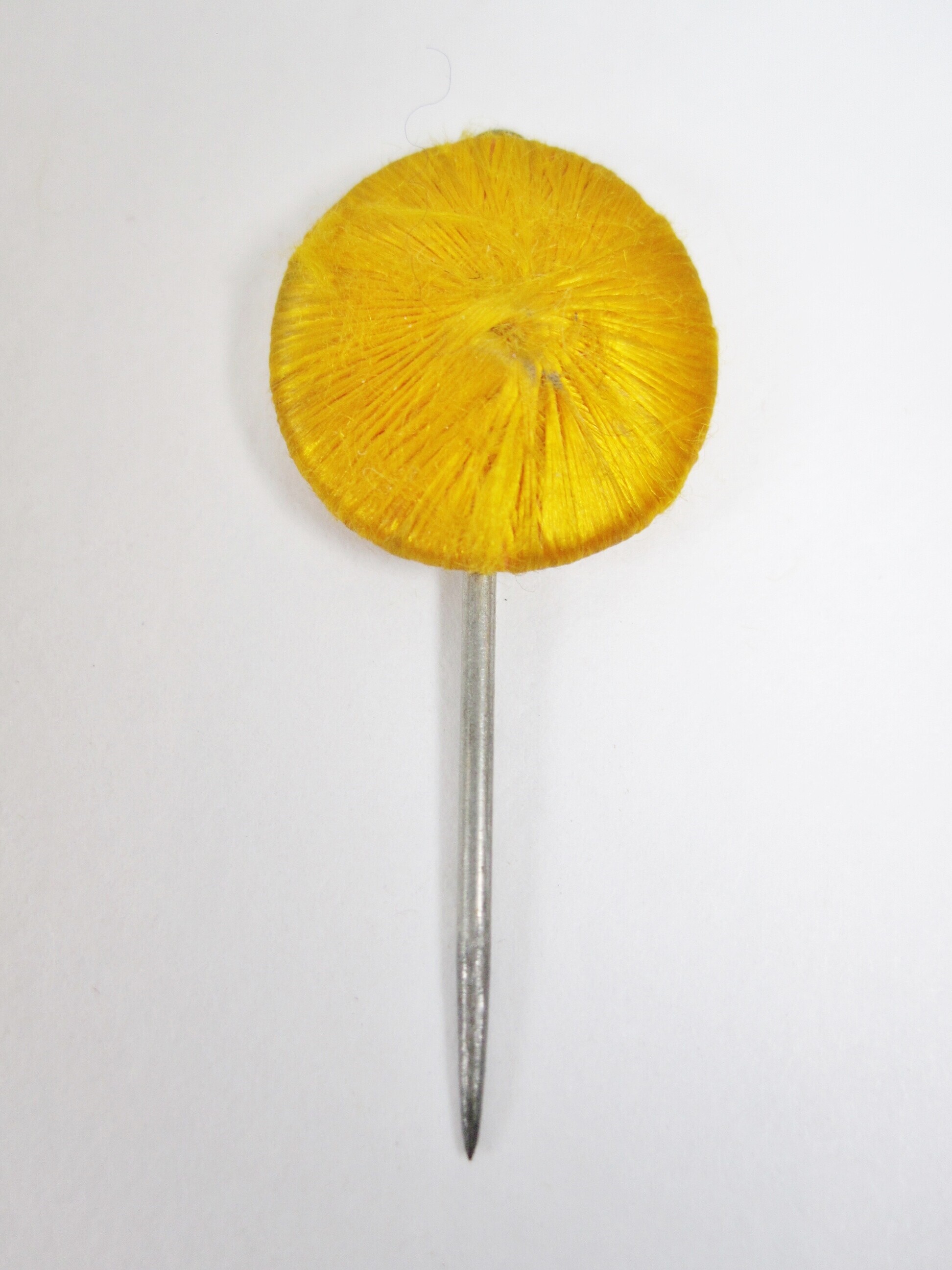 Een zelfgemaakt speldje met een rond plat knoopje overtrokken met oranje naaigaren.