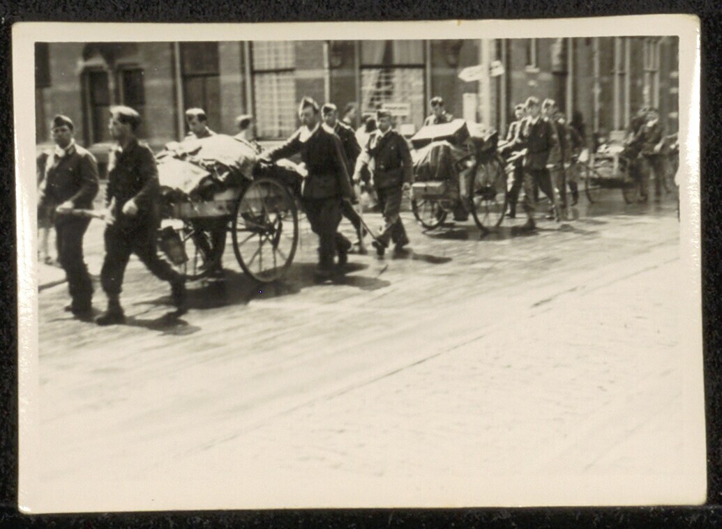 Negen zwartwit foto's van de terugtocht van de verslagen Duitse troepen. Op enkele foto's is ook bewapende geallieerde begeleiding te zien: ongenummerd, geen datum, fotograaf onbekend.