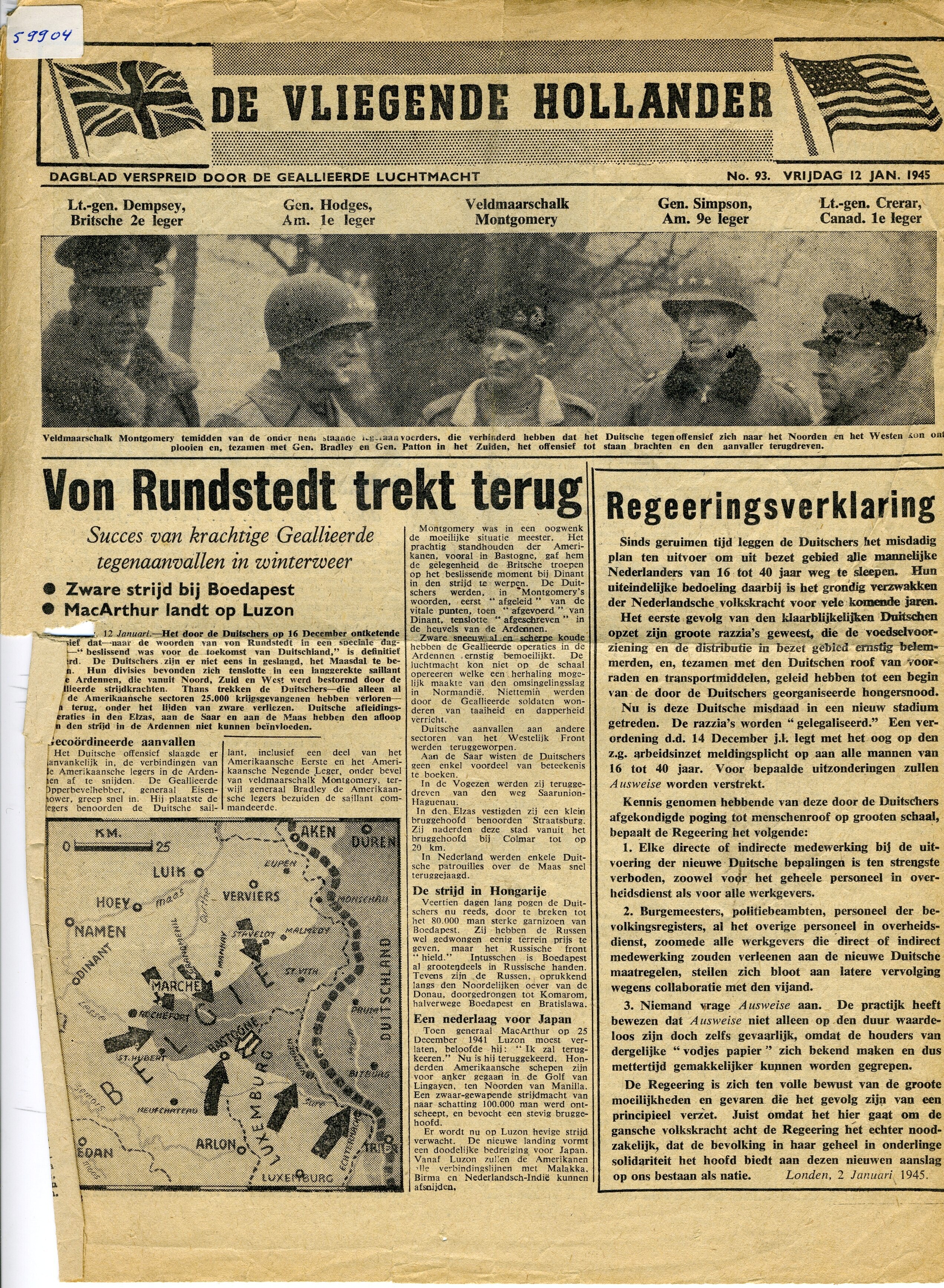 Editie 93 van vrijdag 12 januari 1945 van de verzetskrant ''De Vliegende Hollander''. De krant werd verspreid door de geallieerde luchtmacht. In deze editie aandacht voor de razzia's die in Nederland plaatsvinden.