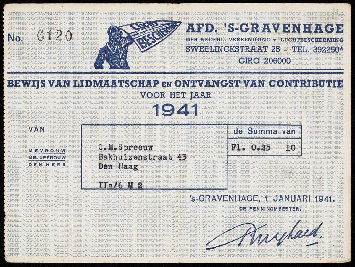 Blauw gedrukt 'Bewijs van lidmaatschap en ontvangst van contributie' voor het jaar 1941 van de Haagse afdeling van de Luchtbescherming op naam van C.M. Spreeuw. Genummerd 6120.