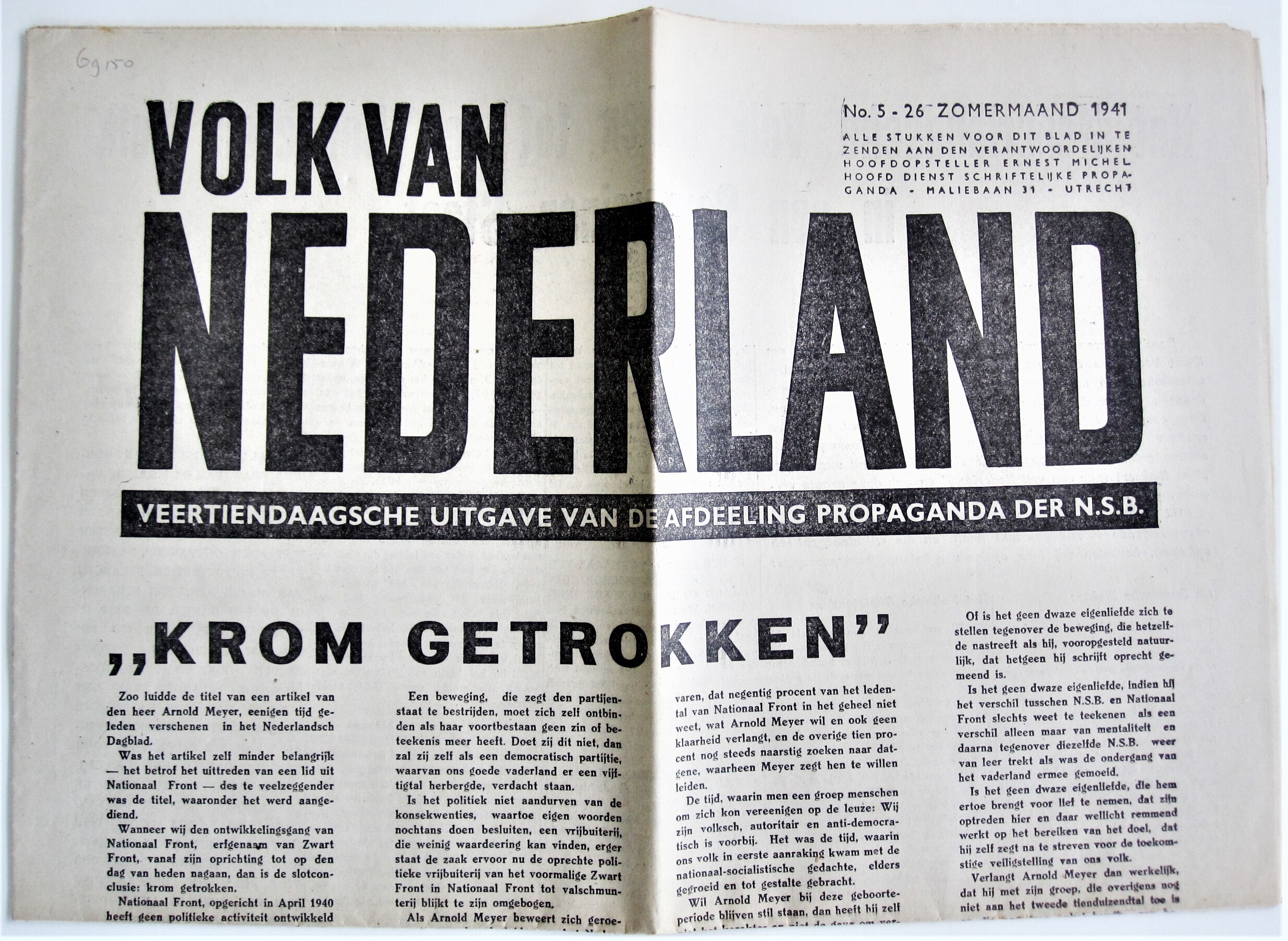 Editie van "Volk van Nederland. Veertiendaagsche uitgave van de afdeeling propaganda der N.S.B". Het betreft nummer 5, 26 Zomermaand 1941.