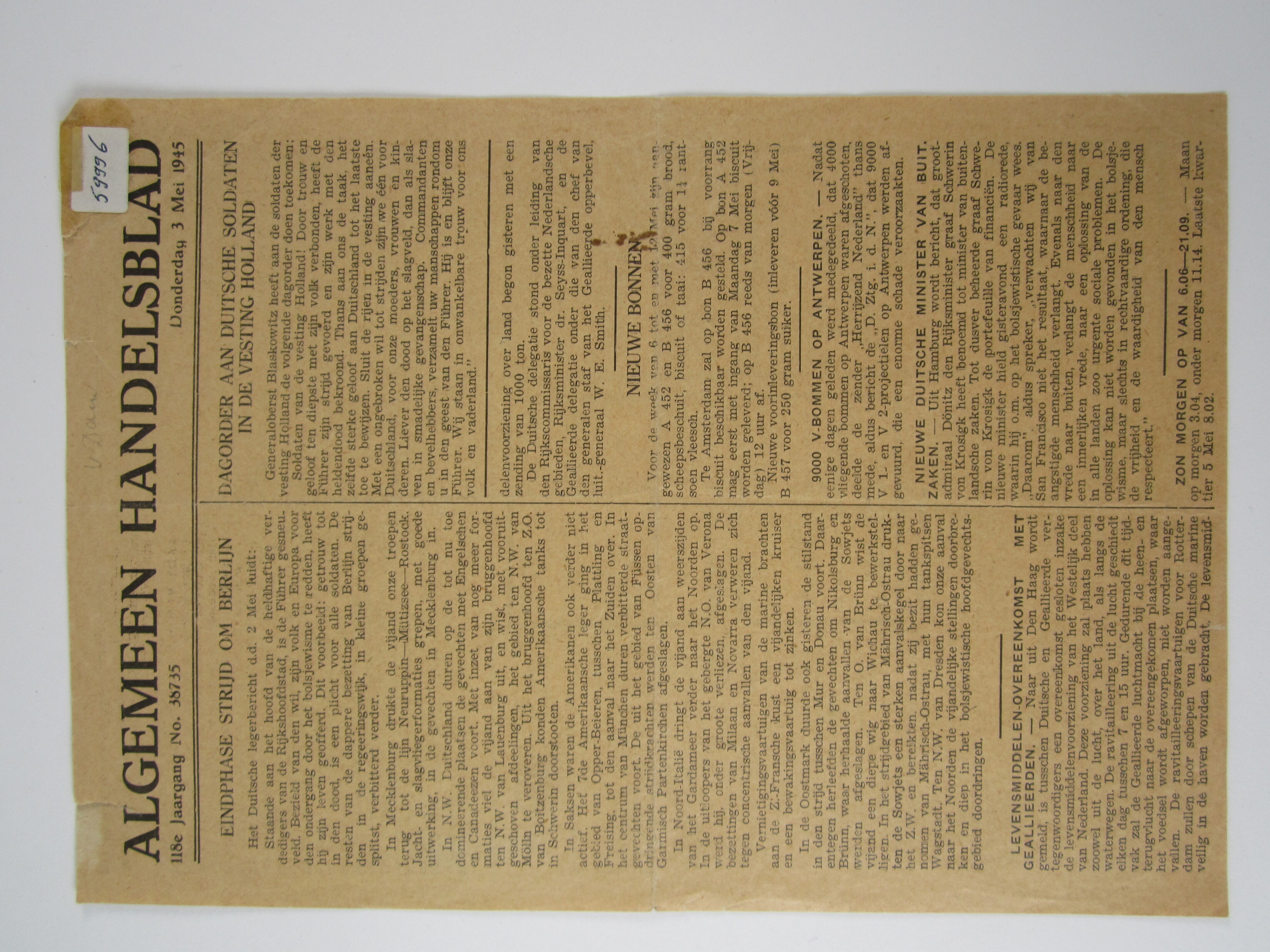 Algemeen Handelsblad, 118de jaargang no. 38735.<br>o.a. "Eindphase strijd om Berlijn".<br><br>
