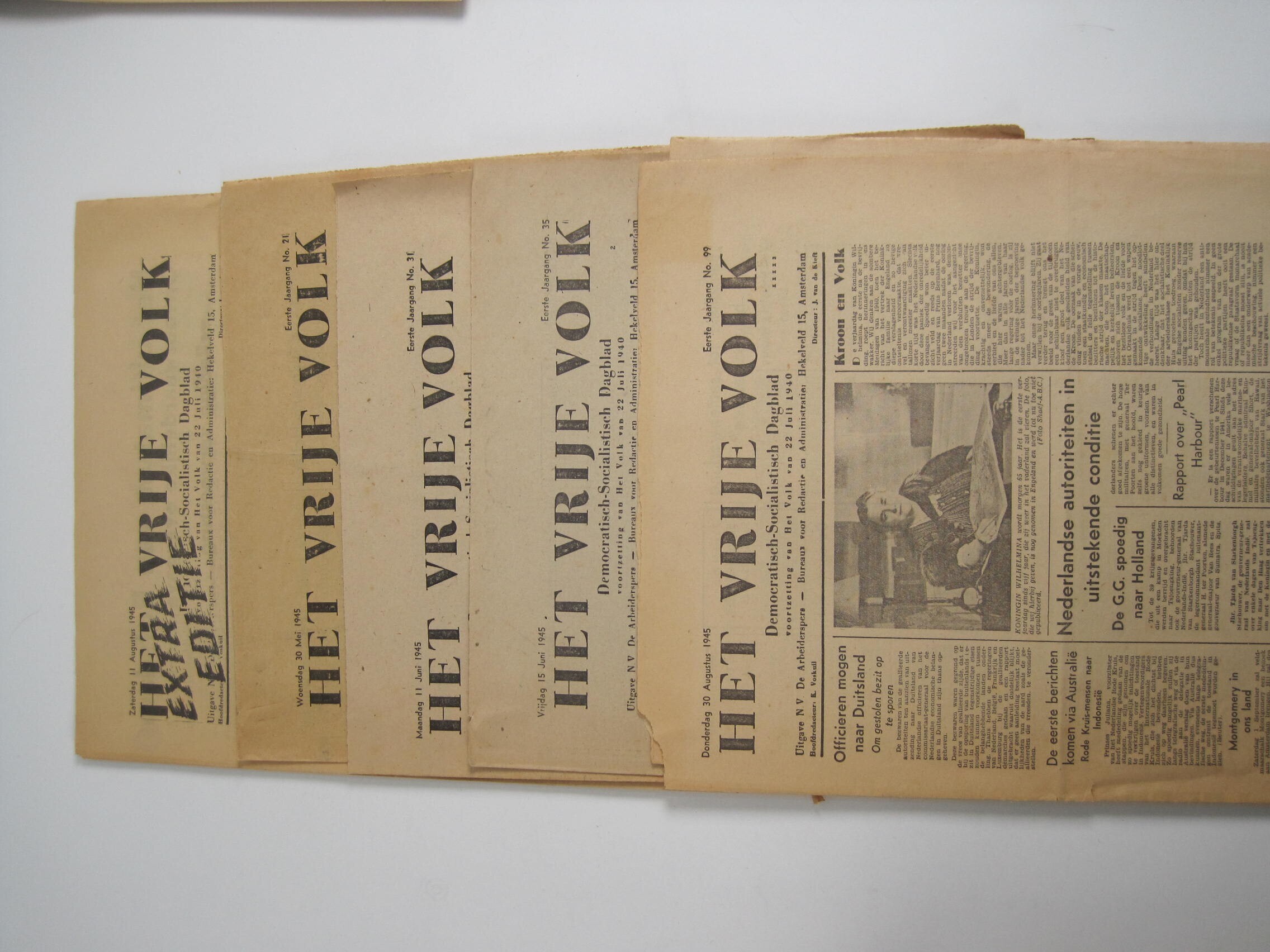 Het Vrije Volk. 5 ex. : 30 mei 1945, 11 juni 1945, 15 juni 1945, 30 aug. 1945 en extra editie i.v.m. capitulatie Japan 11 aug. 1945.
