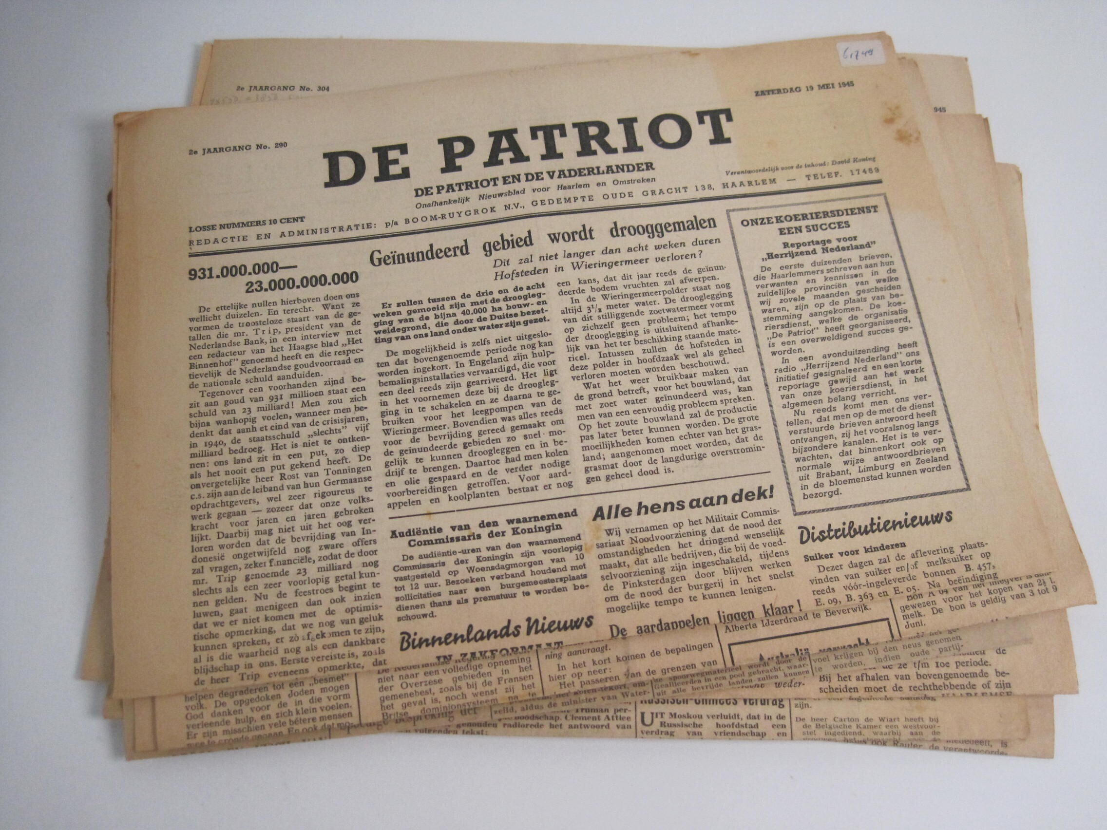 De Patriot, 0nafhankelijk Nieuwsblad voor Haarlem en omstreken.<br>10 exemplaren uit 1945.