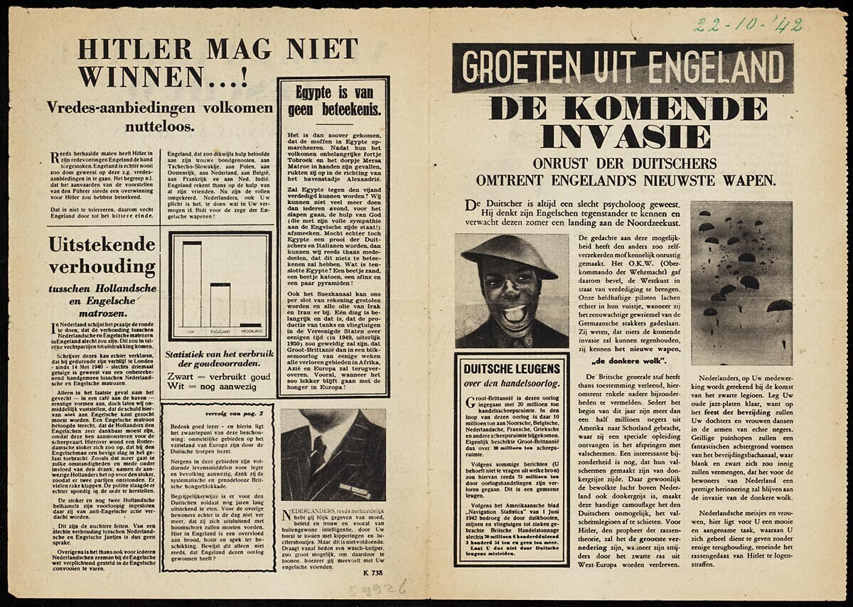 Twee exemplaren van een pro-Duits satirisch pamflet ''Groeten uit Engeland'' onder andere over de komende invasie.