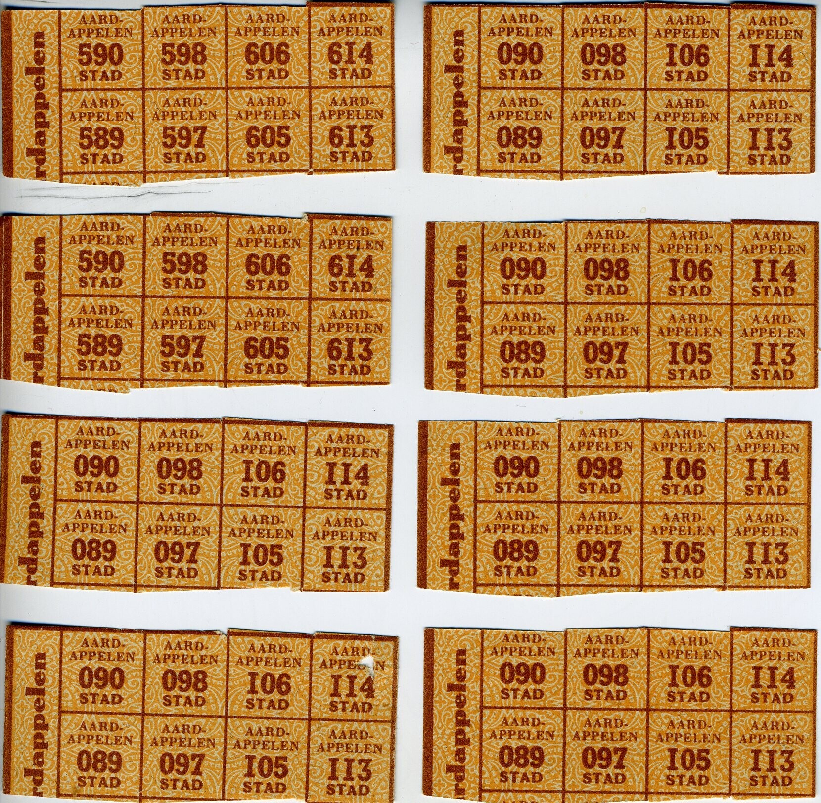 Acht vellen met op ieder in oranjebruine opdruk acht bonnen "Aardappelen stad".
