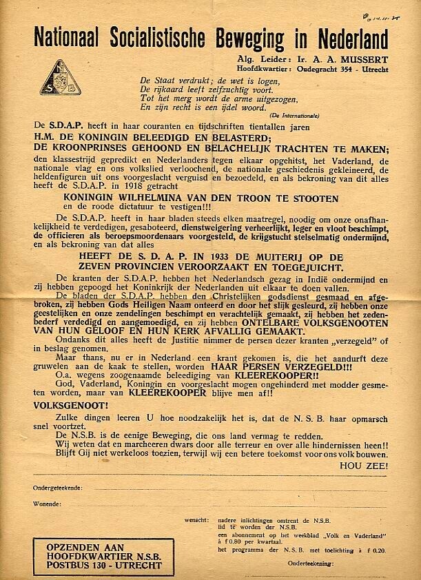 N.S.B.-pamflet waarin de SDAP ervan wordt beschuldigd de monarchie ten val te willen brengen, het Nederlandse gezag in Nederlands-Indië en het christelijke geloof te ondermijnen. Onderaan een bon waarmee men zich als lid van de N.S.B. kan aanmelden.