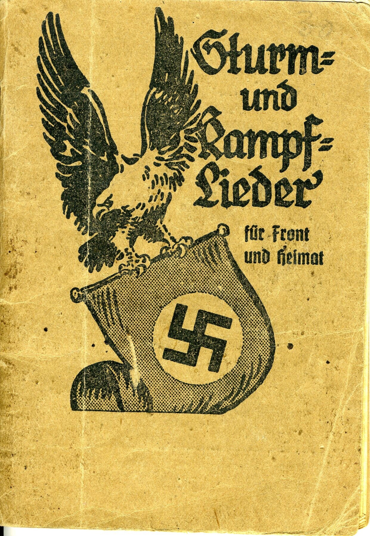 Een Duits liedboek in gotisch schrift gedrukt met titel: ''Sturm- und Kampflieder für Front und Heimat''. De bundel omvat 128 pagina's. Op de beige omslag is een afbeelding gedrukt van een adelaar met in zijn klauwen een wimpel met hakenkruis. In de bundel zijn 230 liederen opgenomen.