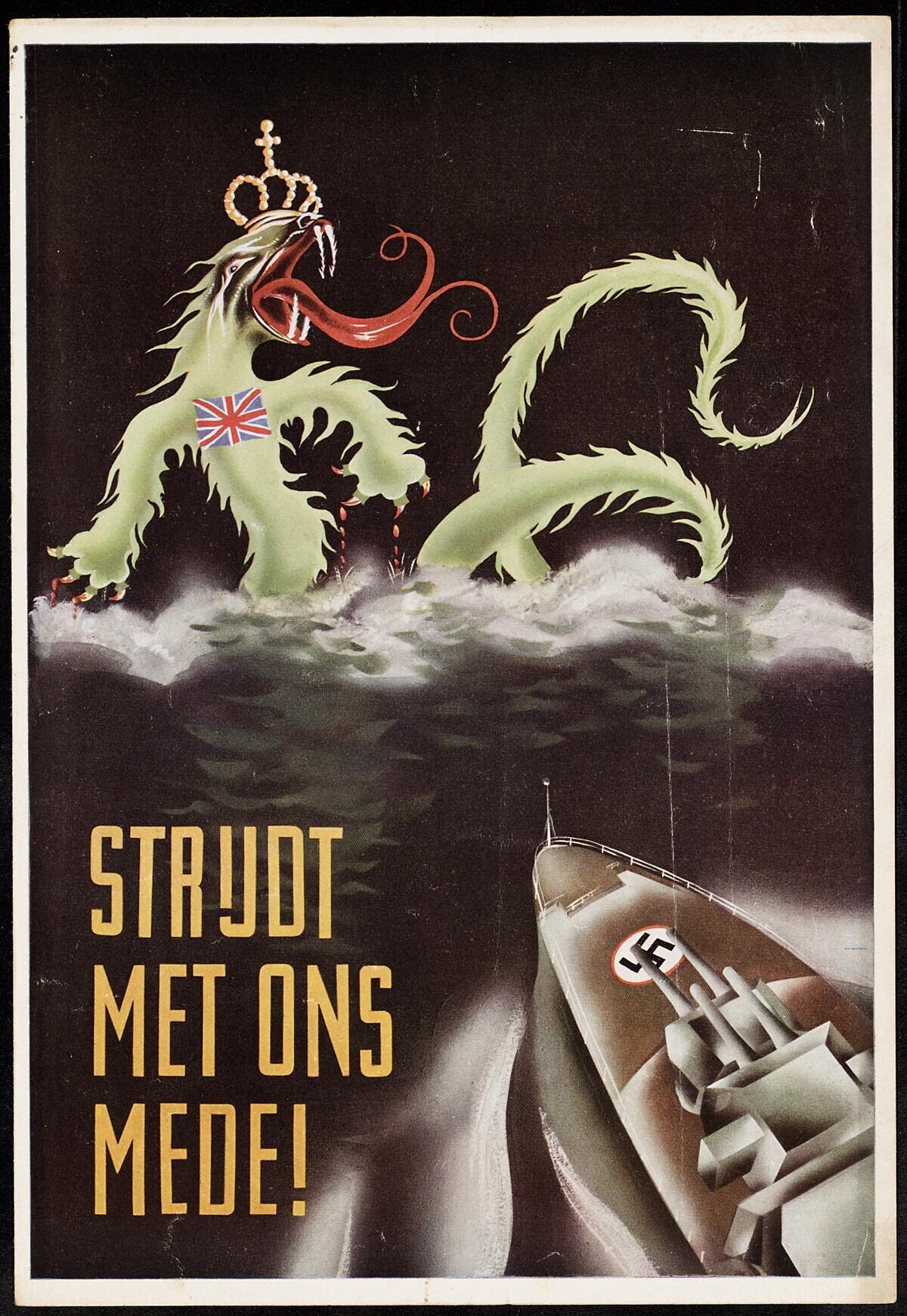 Twee exemplaren van een pamflet met de stelling: "Onze vijand van 1673 is dezelfde als onze vijand van 1943" en de oproep om dienst te nemen bij de Duitse Kriegsmarine. Op de voorkant een oorlogsbodem die afstevent op een draak met een kroon op zijn kop en de Britse vlag op zijn borst.