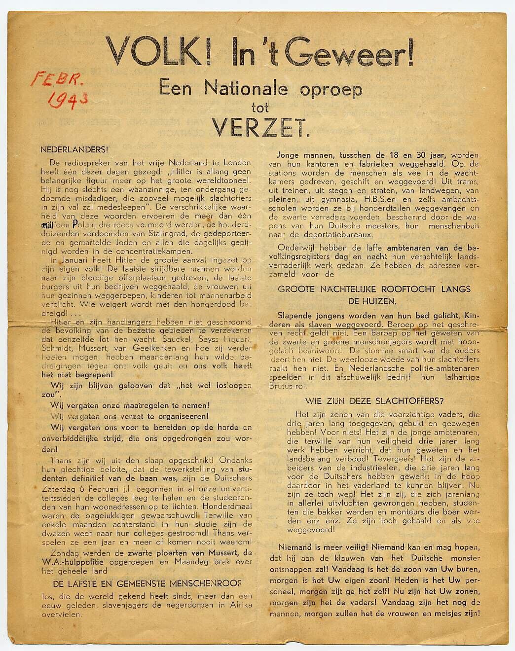Tweezijdig bedrukt blad met een oproep tot verzet: "Geen Nederlander kan thans meer in twijfel verkeeren over zijn plicht. Koningin, Regeering en Vaderland vragen, neen eischen Uw vastberaden deelneming aan den strijd voor de bevrijding van ons grondgebied."