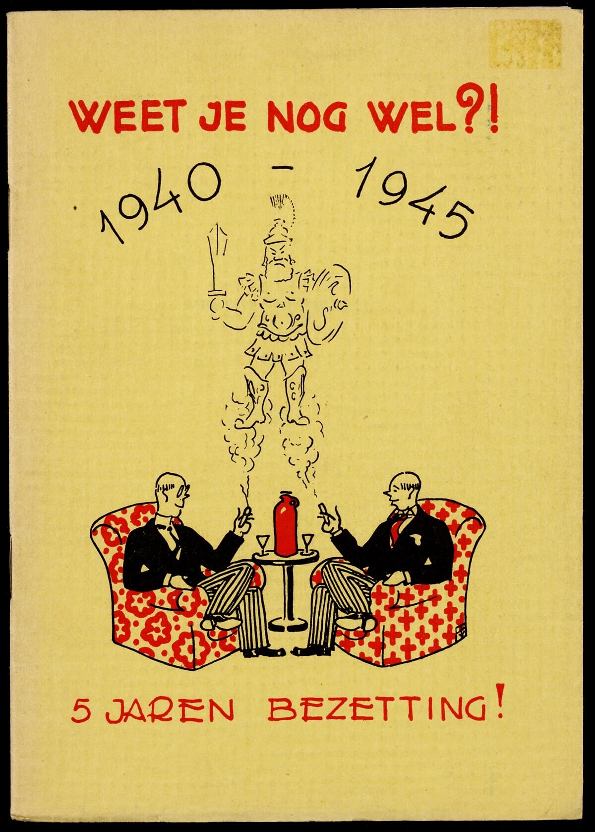 Een gedrukt boekje met op de gele papieren kaft de titel: "Weetje nog wel?! 1940 - 1945. 5 jaren bezetting!" met de afbeelding van twee heren die in grote fauteuils tegenover elkaar zitten en een borrel drinken. Uit de rook van hun sigaren komt de god Mars tevoorschijn. Op de titelpagina staat: "weet je nog wel?! Versjes en prentjes van Han Tienhoven opgedragen aan de "Kleine" helden (de Hollandsche huisvaders) uitgegeven door: Jacs.G. Robbers. - Amsterdam".