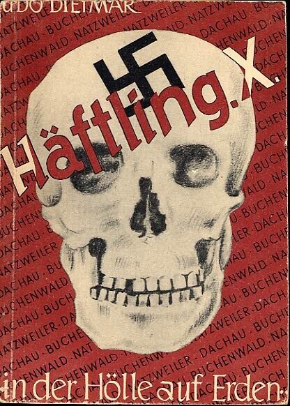 Duitstalig boek over praktijken in Duitse concentratiekampen, opgedragen aan de slachtoffers van het fascisme. Op de kaft een tekening van een schedel met een hakenkruis op een rode achtergrond waarop de namen zijn vermeld van verschillende concentratiekampen.