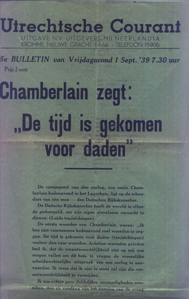 Utrechtsche Courant van 1 september 1939 gedrukt op groen papier. Het hoofdartikel heeft als titel: "Chamberlain zegt: "De tijd is gekomen voor daden." Beschreven wordt het voornemen van de Britse regering haar verplichtingen jegens Polen na te komen ingeval de Duitse troepen zich niet terugtrekken uit Polen. In een klein artikel wordt gemeld dat het hele grondgebied van het Rijk der Nederlanden bij K.B. van 1 september in staat van oorlog is verklaard.