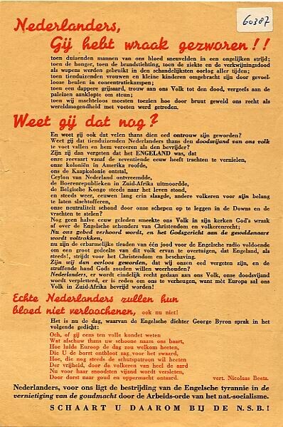 Twee exemplaren van een aan een zijde met rode en witte letters bedrukt strooibiljet met een oproep zich aan te sluiten bij de N.S.B.