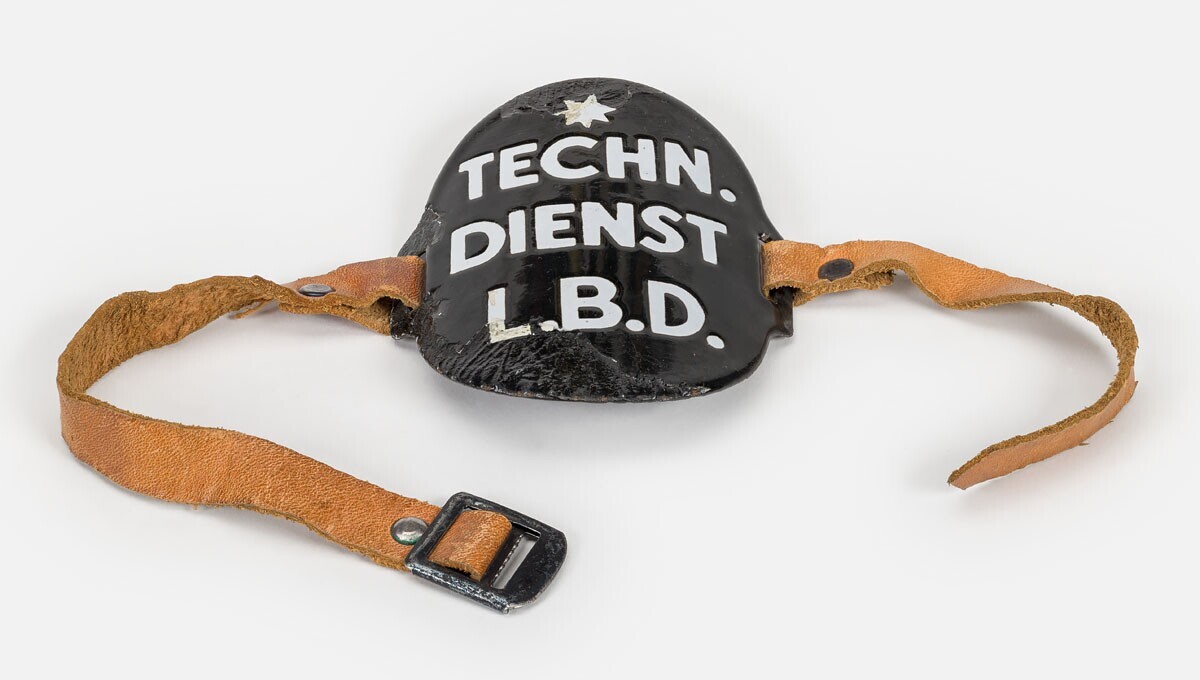 Een zwart geëmailleerd metalen ovalen plaatje van de Luchtbeschermingsdienst (LBD) voorzien van twee leren riempjes om het plaatje rond de bovenarm te bevestigen. Op het plaatje: "Techn. Dienst L.B.D." en daarboven een witte ster.