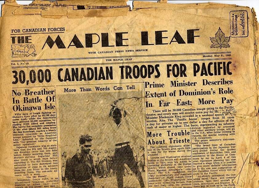 Exemplaar van ''The Maple Leaf". Het betreft volume 3, nummer 48. 21 mei 1943. Op de voorpagina een foto van een executie door een Japanse militair.