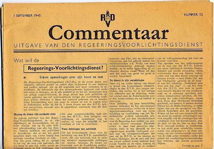 Twee exemplaren van Commentaar, uitgave van de R.V.D. Het betreft de nummers 12 (1 september 1945) en 31 (14 januari 1946).