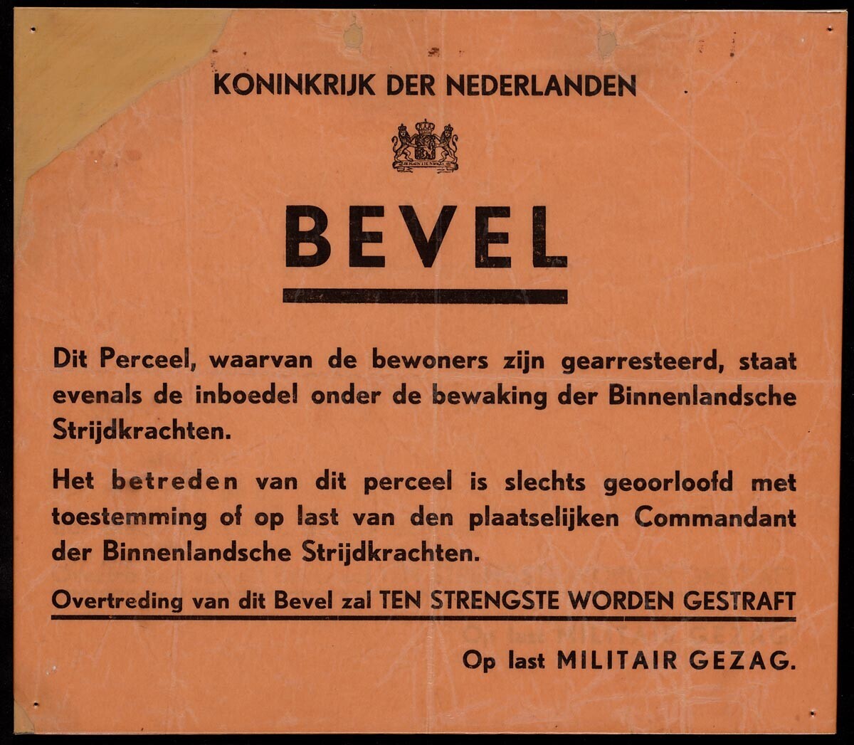 Oranje pamflet met een bevel van het Militair Gezag inzake een verbod om een perceel te betreden waarvan de bewoners gearresteerd zijn. Bovenaan het wapen van de Nederlandse leeuw en "Koninkrijk der Nederlanden".