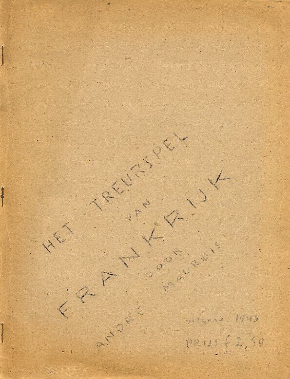 ''Het treurspel van Frankrijk'' is een gestencilde uitgave van een getypt document waarin de schrijver antwoord geeft op de vraag waarom Engeland en Frankrijk slecht op de oorlog waren voorbereid. Het document omvat 59 pagina's.