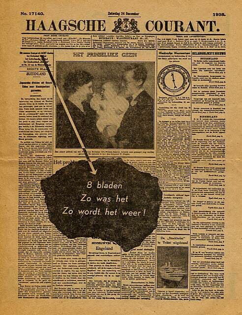 Reclamefolder van het dagblad 'Haagsche Courant' met de afbeelding van de uitgave van 24 december 1938 waarop een foto van 'Het Prinselijk Gezin'. Daaronder in een zwart veld aangewezen met een pijl de tekst: '8 bladen. Zo was het. Zo wordt het weer!'
