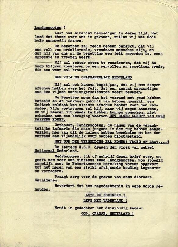 Doorslag van een tekst, gericht tegen de Duitse bezetter en de NSB en met de oproep: "Houdt in gedachten het drievoudig snoer: God, Oranje, Nederland!"