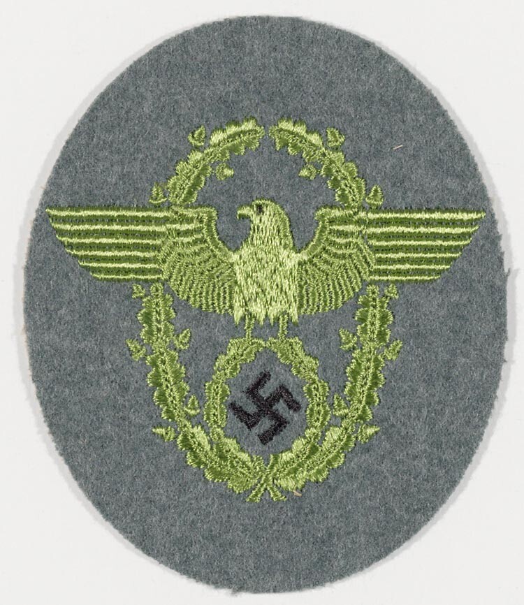 Een ovaal embleem van de Duitse militaire politie (Feldgendarmerie) gemaakt van blauwgrijs vilt waarop met groen garen de Duitse rijksadelaar met gespreide vleugels is geborduurd met en in de klauwen het hakenkruis. Het hakenkruis is met zwart borduurgaren aangebracht. Het geheel binnen een krans van eikenbladeren met eikels.