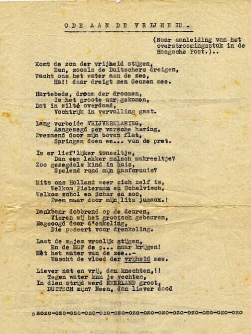 Gedicht van acht coupletten elk van vier verzen over de bevrijding. Het tweede en het vierde vers van de coupletten springen in. Het gedicht is onderlijnd met een herhaald 'ozo-ozo'.