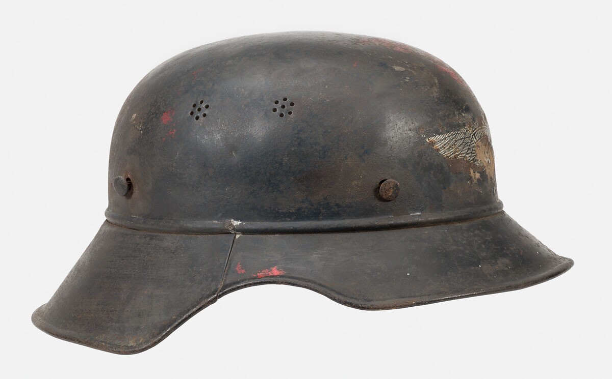 Zwarte Duitse helm, gladiator model. Op de voorkant een adelaar met daarop de tekst: "Luftschutz" met daaronder een hakenkruis. De achterklep is langer dan de voorklep. Aan de binnenkant van de achterklep staat: "Vertrieb genehmigt ......... 8 Luftschtzgesetz Hochstpreis R M 83 (?)". Neknummer: "PL2 39/14". De helm was in Duitsland voor iedereen beschikbaar als bescherming tegen lucht aanvallen.
